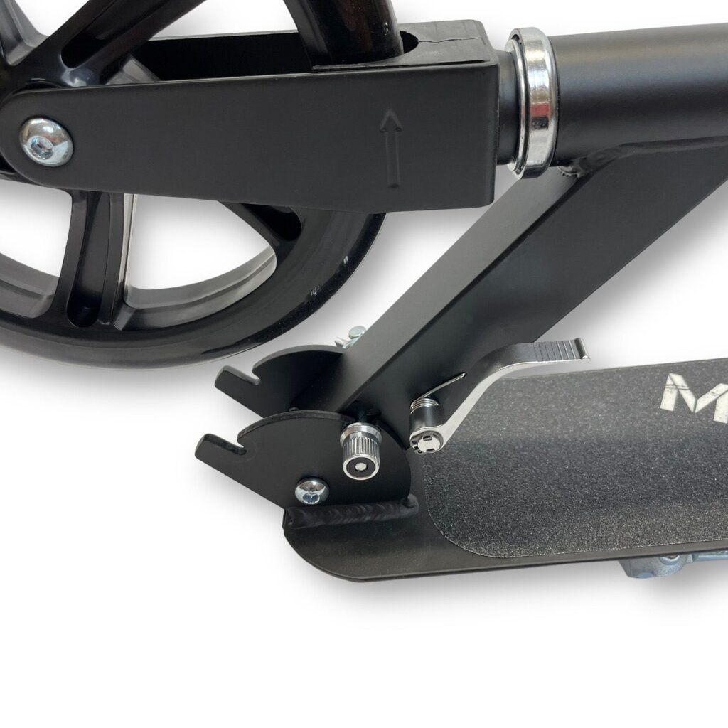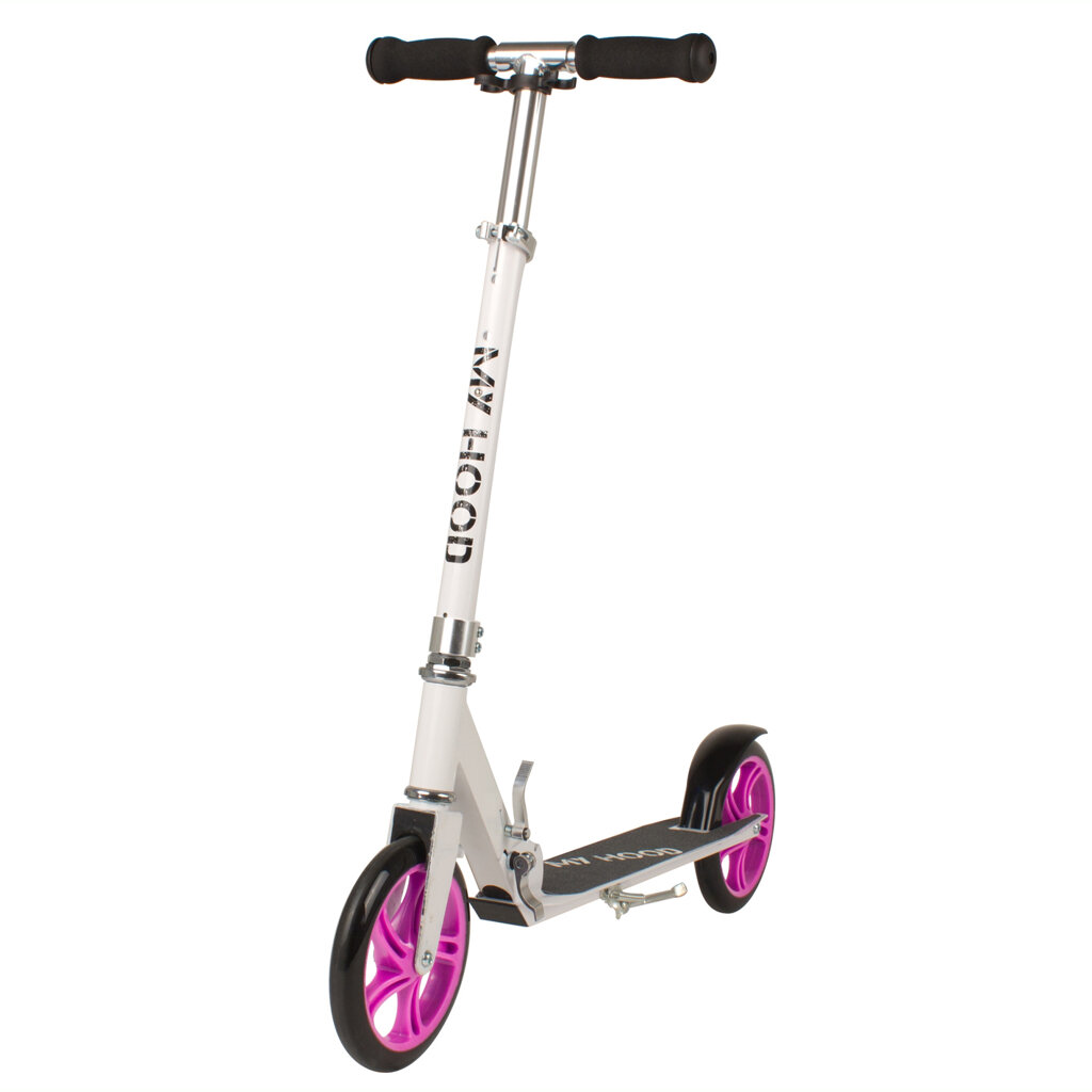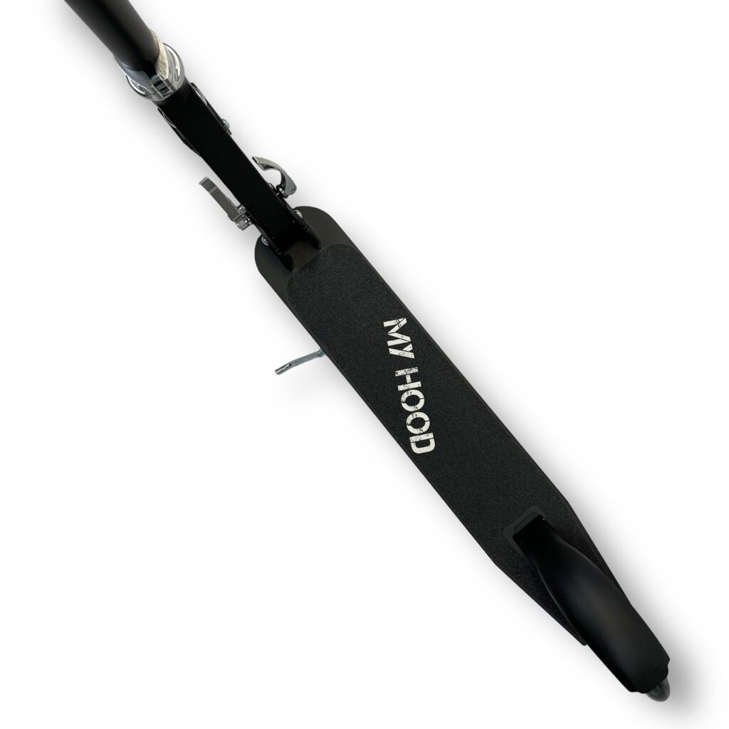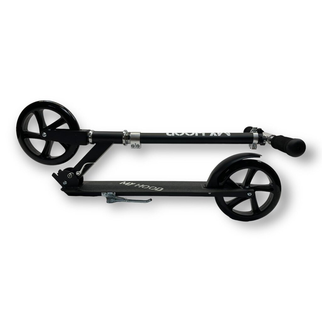 Tato opravdu kvalitní klasická koloběžka je opatřena velkými 200mm PU kolečky, která spolu s kuličkovými ložisky ABEC 5 zajišťují pohodlnou jízdu bez námahy. Pevný hliníkový rám se silným lakováním koloběžce zajišťuje dobrou odolnost a to při hmotnosti pouhých 3,6 kg. K výbavě koloběžky patří i výkonná brzda na zadním kole. Koloběžka My Hood 200 disponuje nosností 100 kg a výšku řídítek lze nastavit v rozmezí od 88 do 98 cm. Díky chytrému skládacímu mechanismu koloběžku snadno a rychle složíte - ať již za účelem transportu či uskladnění. Kolobězka je vhodná pro děti od 5ti let.