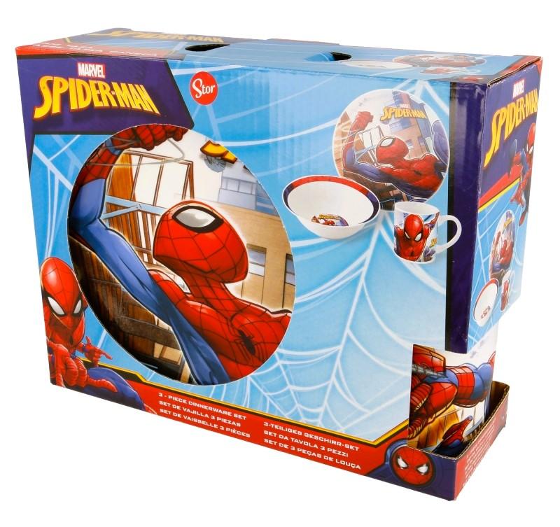 3 - keramická souprava s motivem Spiderman. Obsahuje: hrneček, objem 250 ml mělký talíř - průměr 19 cm hluboký talíř (miska) - průměr 19 cm, hloubka 6 cm. rozměry: 25 x 19,7 x 8,7 cm hmotnost: 964 gr. Materiál: keramika vhodný do mikrovlnné trouby vhodný do myčky na nádobí Vhodné pro děti od 4 let. Baleno v dárkovém kartonovém obalu. Výrobce: Stor. Stor, S.L.P. General Martínez Campos 5328010 Madrid, Spain info@storline.com