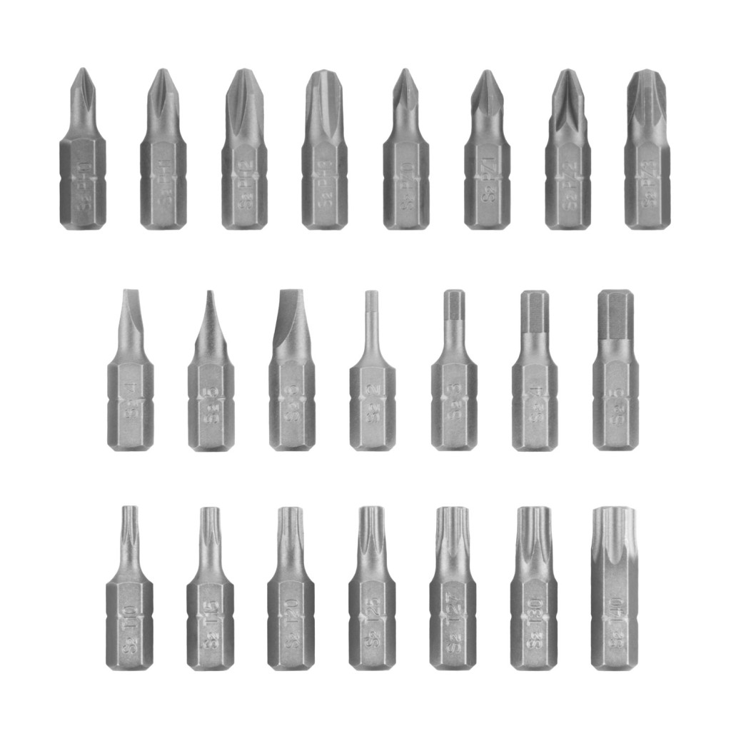 23ks 25mm bitů: Phillips: PH0, PH1, PH2, PH3