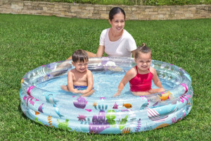 Dotaz na produktNafukovací bazén s potiskem mořského světa. Bazén má tři samostatně nafukovací prstence, které jsou zabezpečené proti nechtěnému úniku vzduchu. Součástí dodávky je sada na zalepení drobných děr.