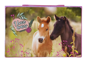 Velká umělecká sada v praktickém kufříku. Obsahuje 71ks příslušenství. Potisk s motivem Koně je na všech dílech sady a na uzavíratelném plastovém kufříku s ouškem. Sada obsahuje: 15 cm pravítko 12 pastelek 12 fixek vodové barvy štětec tužku gumu ořezávátko lepidlo 12 pastelek 12 voskovek Rozměry kufříku: 31 x 21 x 4 cm Výrobce: Derform.