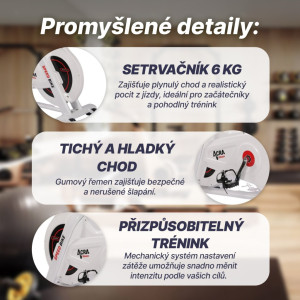 - Setrvačník 6kg:Lehčí setrvačník se snáze roztočí a zpomalí,čímž zajišťuje plynulý chod a realistický pocit z jízdy,jako byste jeli venku na kole.To je ideální pro začátečníky a jezdce,kteří preferují komfortní a tichý trénink.