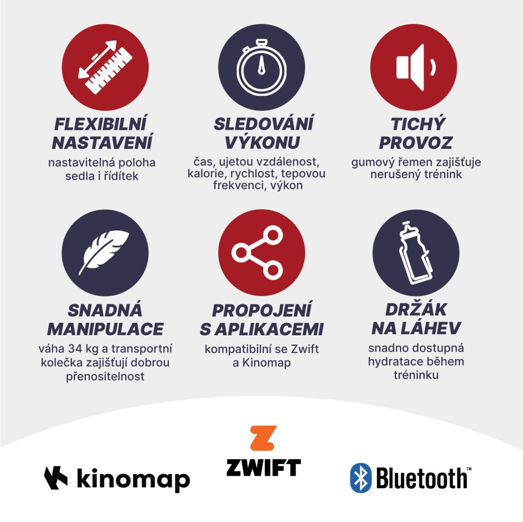 - Kompatibilní s aplikacemi: Možnost připojení přes Bluetooth na oblíbené aplikace, jako je Zwift a Kinomap, pro zábavnější a interaktivnější trénink.