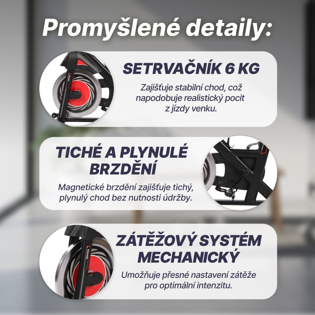 - Setrvačník 6kg:Lehčí setrvačník se snáze roztočí a zpomalí,čímž zajišťuje plynulý chod a realistický pocit z jízdy,jako byste jeli venku na kole.To je ideální pro začátečníky a jezdce,kteří preferují komfortní a tichý trénink.
