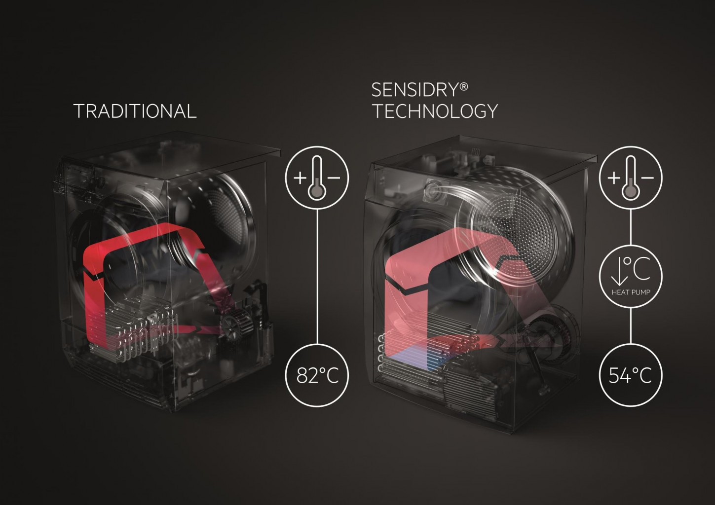 Technologie SensidrySušičky AEG s technologií SensiDry suší při nízkých teplotách a využívají precizní senzory na monitorování cyklu sušení. Oděvy tak nebudou nikdy vystavené zbytečnému teplu a déle si zachovají strukturu, kterou měly ještě jako úplně nové. Nízká teplota navíc pomáhá šetřit energii.