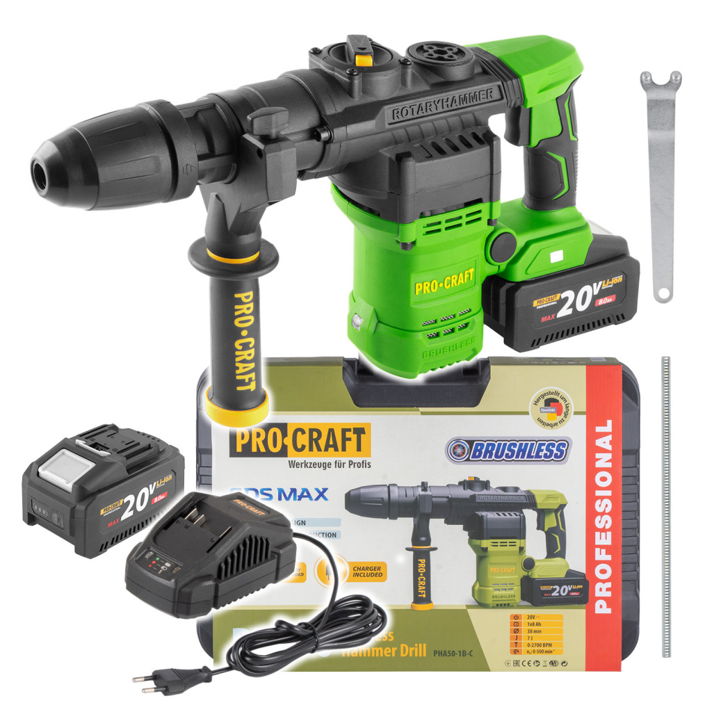 Dotaz na produkt Na splátky ještě dnesAku vrtací kladivo Procraft PHA50-1b-c s bezuhlíkovým motorem. Režimy vrtání s příklepem a sekání, síla úderu 7 J, otáčky 0–500/min⁻¹ , příklepy 0–2700/min⁻¹ . Ideální pro stavební a renovace práce. Součástí balení je baterie, nabíječka a kufr.