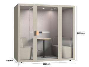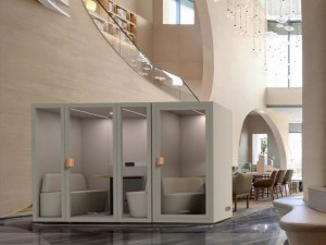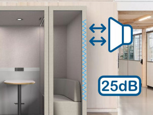 Kabina je vybavena prosklenými dveřmi, LED osvětlením, ventilačním systémem a elektrickými zásuvkami. Konstrukce je tvořena kombinací akustických materiálů určených ke snížení hluku. Díky skrytým kolečkům je kabina mobilní.