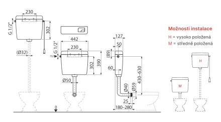 • při instalaci na vysoko položenou nádržku je funkční pouze velké spláchnutí 6-8 l