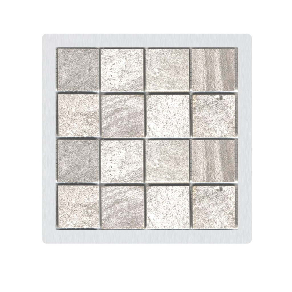 Dno mřížky je přelepeno pásem s hrubým povrchem pro bezpečné přilepení vložené dlažby; Materiál: nerezová ocel AISI 304, DIN 1.4301