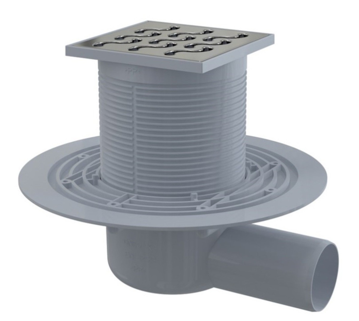 Masivní nerezová mřížka 102×102×4 mm; Výškově upravitelné hrdlo 9–95 mm; Široký izolační límec pro napojení na hydroizolaci stavby; Boční napojení na odpad Ø50 mm; Mechanicky čistitelný sifon až po odpadní trubku; Vodní zápachová uzávěra brání pronikání zápachu z kanalizace; Kompatibilita s dílci podlahových vpustí včetně vodní, suché a kombinované zápachové uzávěry SMART; Materiál: polypropylen odolný proti mechanickému, chemickému a tepelnému poškození