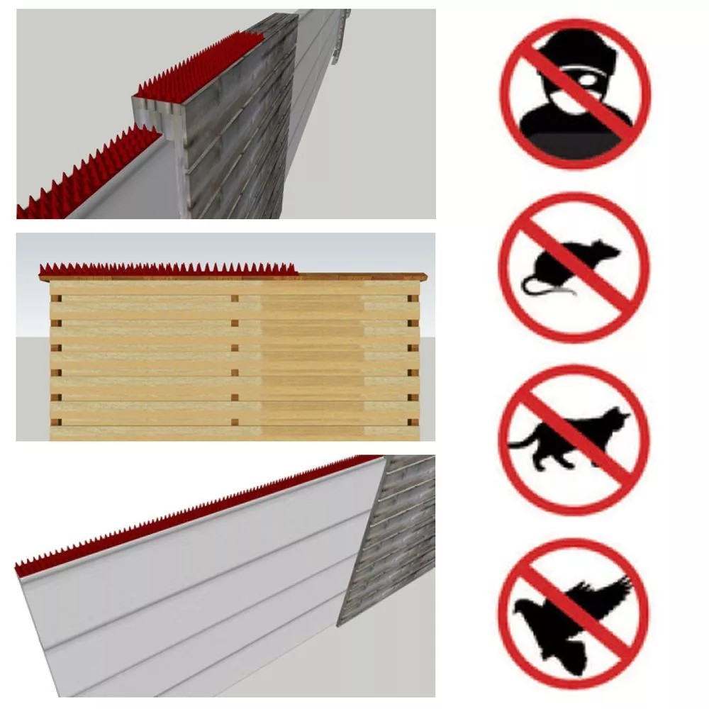 Plátky s hroty jsou také ideální k zabránění kunám, mývalům nebo kočkám ve šplhání po stromech nebo okapech. Materiál protišplhavých pásů je odolný vůči UV záření, a proto je vhodný pro dlouhodobé venkovní použití. Hroty proti šplhání se snadno instalují pomocí šroubů, lepidla, hřebíků, oboustranné pásky atd. (nejsou součástí balení).