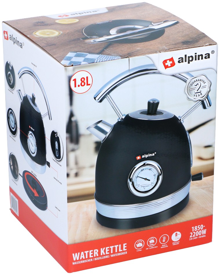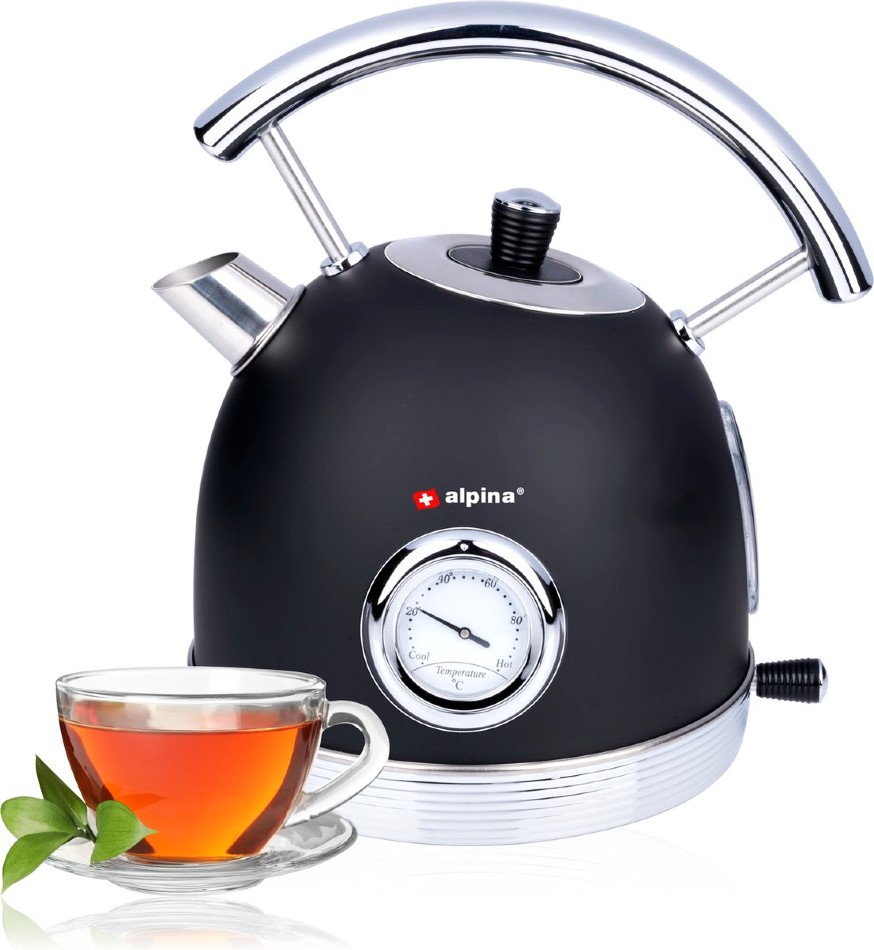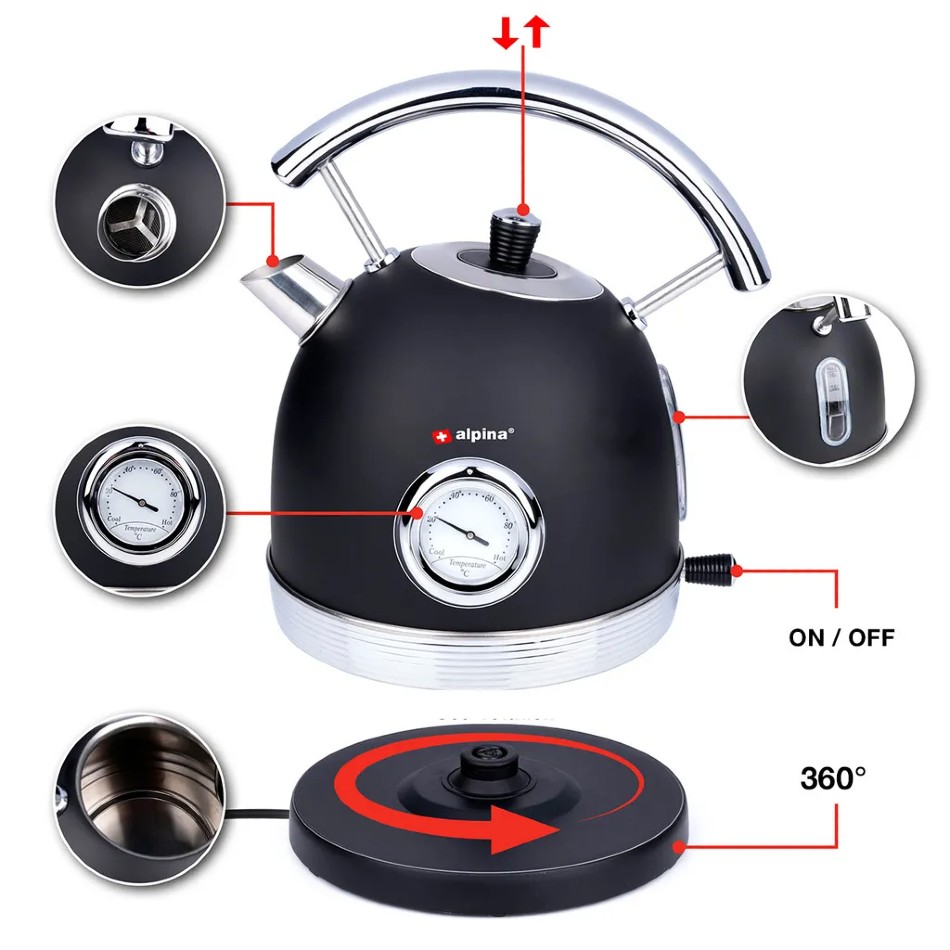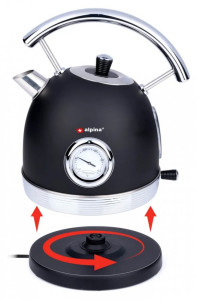 Hledáte retro rychlovarnou konvici, která během chvilky dostane vodu na perfektní teplotu? Pak je tato konvice alpina retro černá to pravé pro vás. Tento dávkovač horké vody má kapacitu 1,8 litru, je vybaven vestavěným termostatem, průhledným ukazatelem hladiny vody, ochranou proti vyvaření a ocelovou rukojetí, díky které je nalévání vody snadné a bezpečné.