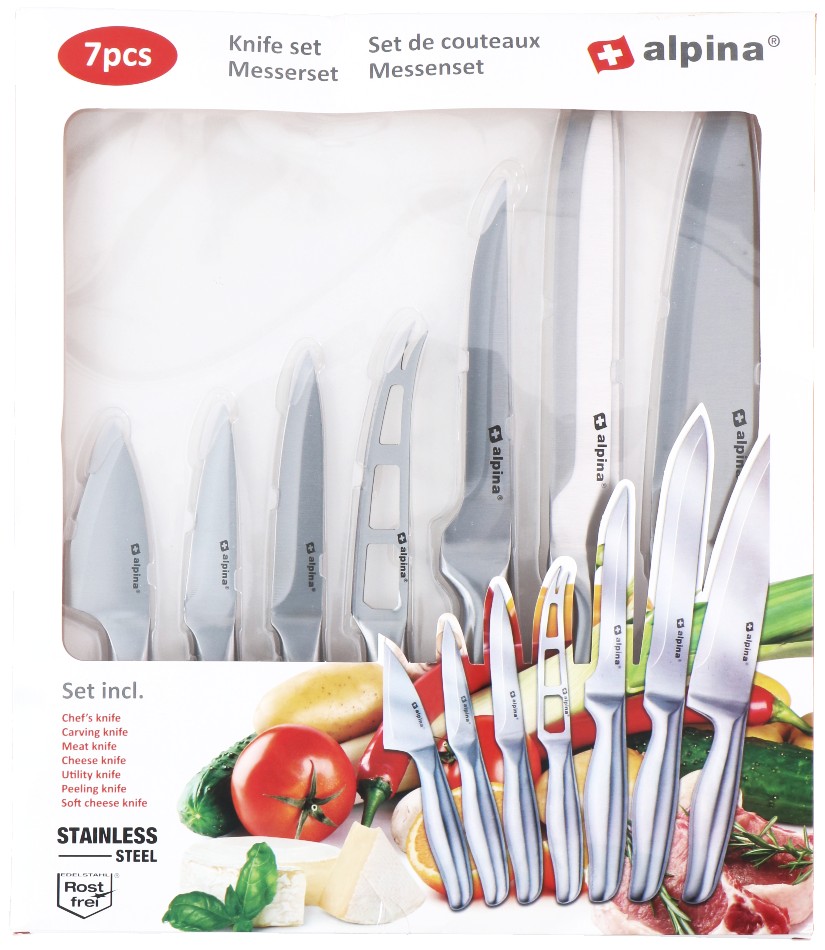 Dotaz na produktHledáte sadu nožů pro všechny možné účely? Tato sada nožů alpina obsahuje 7 různých nožů, včetně kuchařského nože, nože na maso, nože na sýr a krájecího nože. Takže s tím můžete jít oběma směry. Nože jsou všechny vyrobeny z nerezové oceli, takže je lze bez poškození vložit do myčky nádobí.Technické údaje Sada nožů alpinaObsah:Kuchařský nůž: 34,5 cmŘezbářský nůž: 34 CMŘezbářský nůž: 29,5 cmNůž na sýr: 23,5 cmNůž Stanley: 22 cmNůž na krájení: 20 cmNůž na měkký sýr: 19 cmMateriál: nerezová ocelZnačka: Alpina