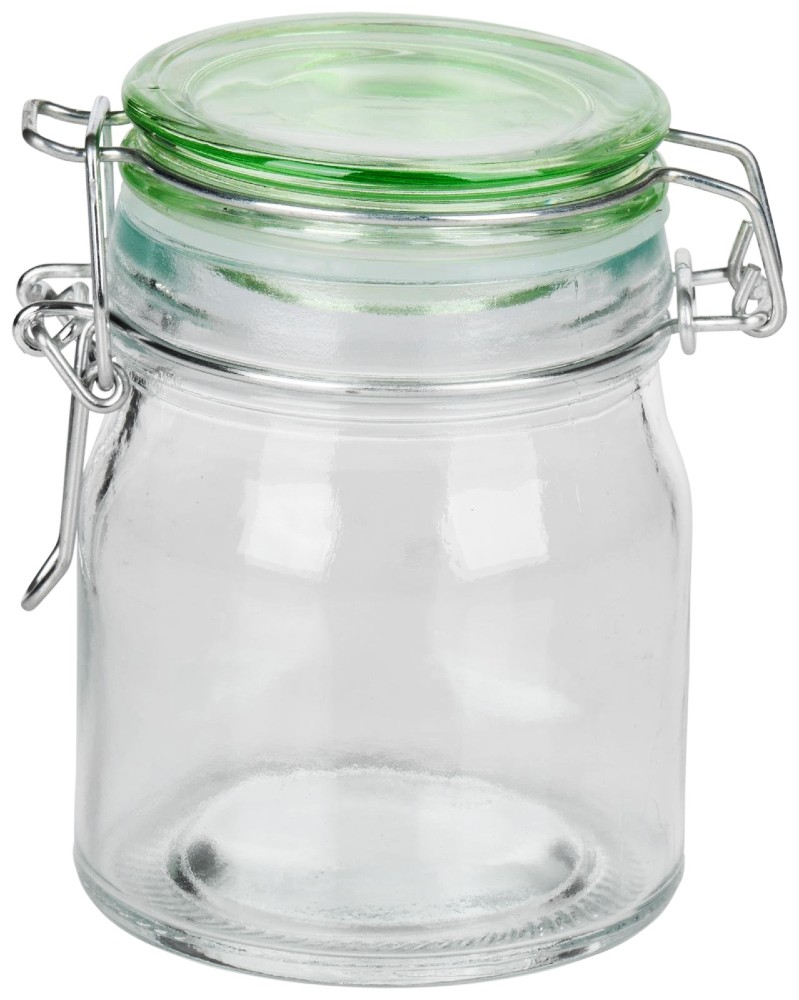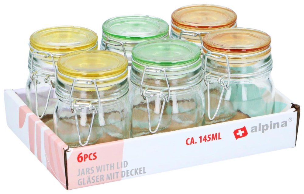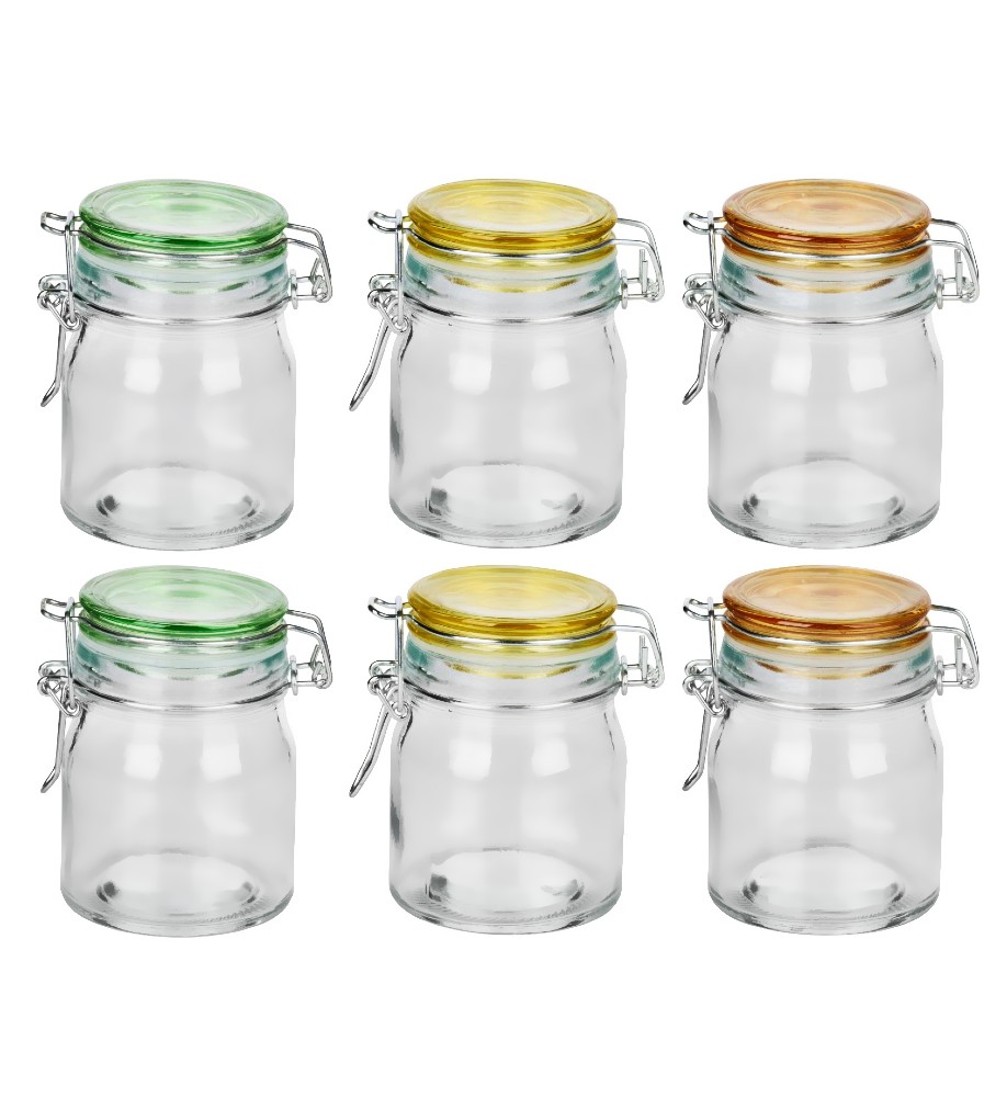 Obsah: 6 skleněných dóz s víčky v různých barvách