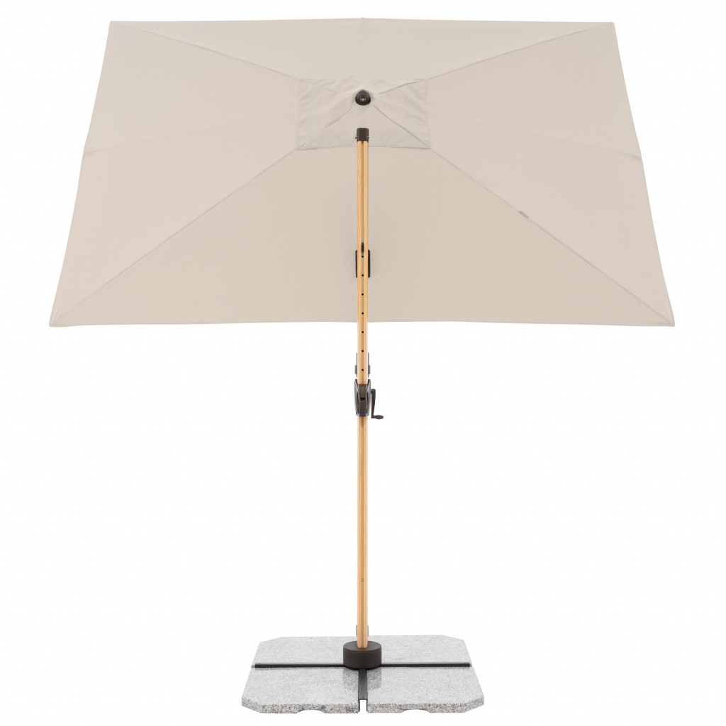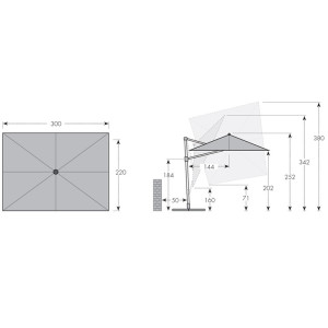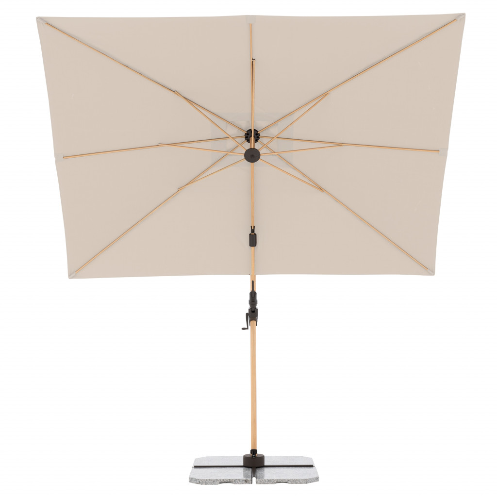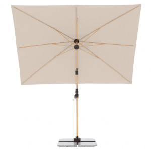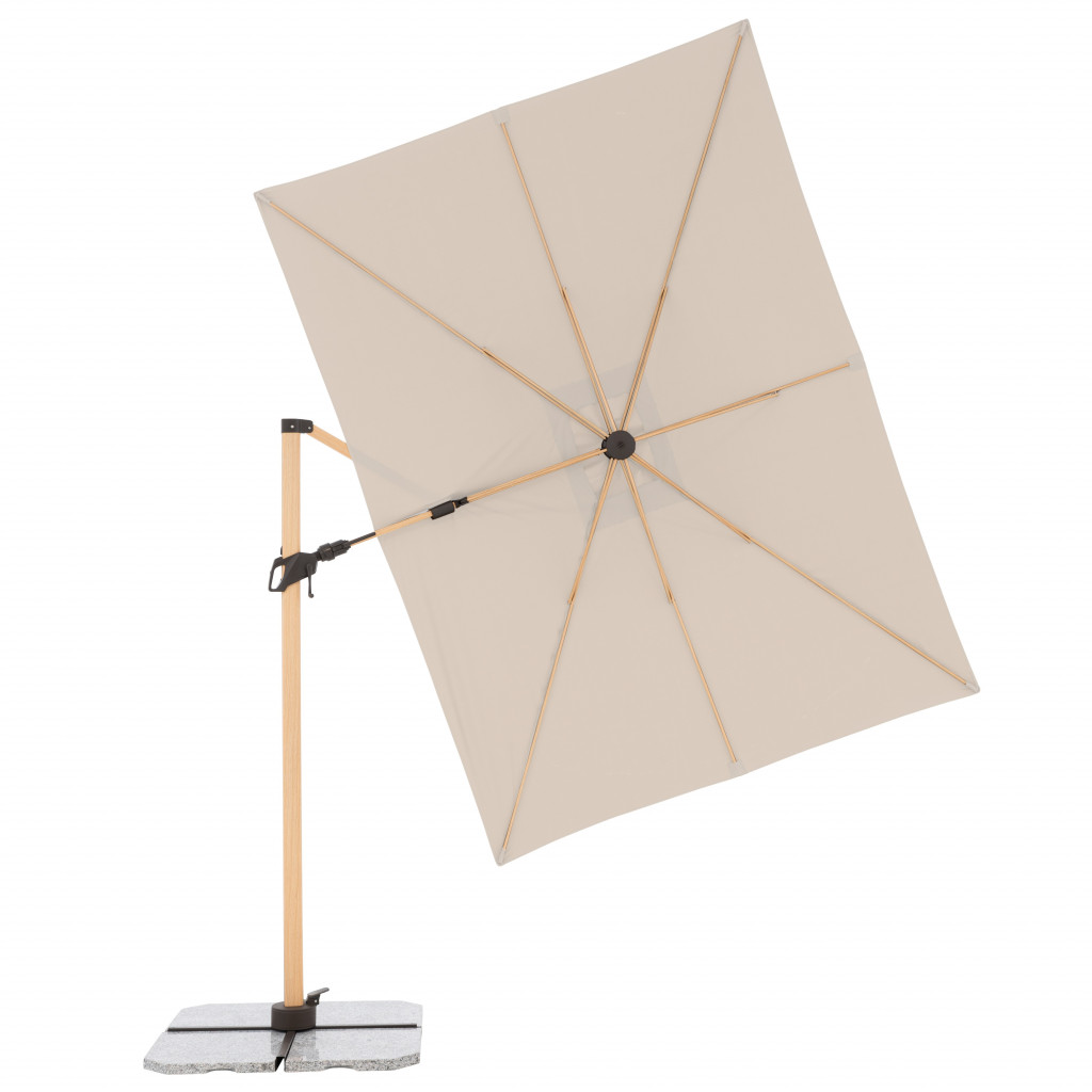 - prakticky k nerozeznání od přírodního dřeva. Spojuje tak odolnost, lehkost a stabilitu hliníkových slunečníků s nadčasovým, estetickým dřevěným designem. Díky svému obdélníkovému tvaru je tento robustní slunečník zvlášť vhodný i na balkony, lodžie a terasy. Jednoduchý posuvný mechanismus s mnoha nastavenými sklony, možnosti natáčet slunečník nožním pedálem až o 360° umožňuje slunečník optimálně přizpůsobit měnící se pozici slunce. Slunečník je vybaven klikou pro snadné a rychlé otevírání a zavírání střechy. Kvalitní potah ze 100procent polyesteru má vynikající ochranu proti UV záření (80 plus ). Díky ventilačnímu otvoru ve střeše se navíc pod slunečníkem nekumuluje horký letní vzduch. Informace o produktu: Velikost slunečníku: cca 220 x 300 cm Obdélníkový tvar střechy Včetně základního kříže pro desky o rozměrech 50 x 50 cm (85599DPE25 nebo 85599DPE55) (Pozor: desky musí být objednány samostatně) Doporučené zatížení: min. 125 kg Podchozí výška: cca 202 cm Celková výška otevřeného slunečníku: cca 252 cm Naklápěcí v mnoha polohách Otočný nožním pedálem o 360° Rozteč otvorů k uchycení (meřeno přes střed): 105 mm Velikost balení: cca 259 x 40 x 20 cm Váha balení: cca 25 Kg Rám: Průměr tyče: 78/50 mm Hliníkový rám Ocelové vzpěry Kličkový mechanismus Potah: 100procent polyester 180 g/m2 SPF 80 plus Stálobarevnost 5 plus Odolný proti dešti K dispozici v různých barvách Možnosti montáže: a) Instalace na zemní kotvu art. č. 85999BRUN b) Instalace na žulový stojan s kolečky 140 kg art. č. 85897GPZ (možné pouze v kombinaci s adaptérovou deskou art. č. 85999A12_16) c) Instalace pomocí plnitelných dlaždic 4dílný set (140kg) art. č. 85499BP35 d) Instalace pomocí zátěžových desek 50 x 50 cm, art. č. 85599DPE25