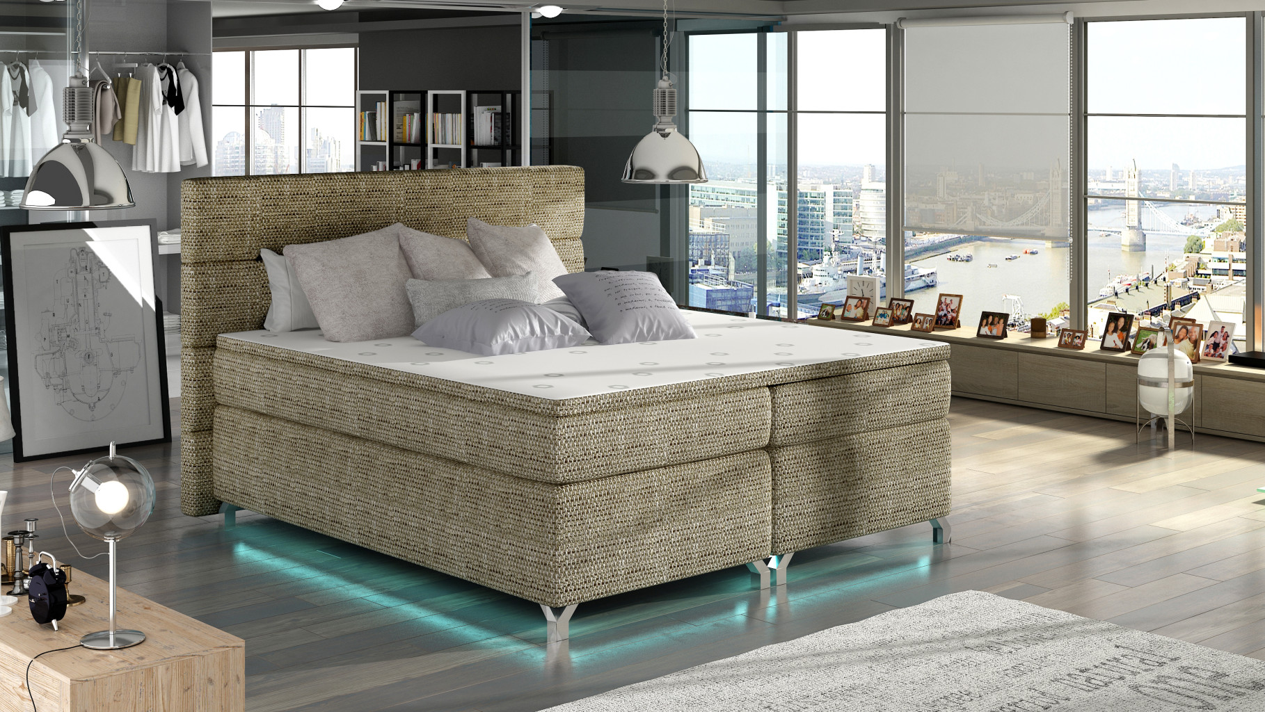 Dotaz na produkt Na splátky ještě dnesAmadeo je mimořádně pohodlná, robustní a originálně navržená boxspringová postel, která zaujme svým neobvyklým tvarem a doplňkovými dekoracemi. Je k dispozici ve třech variantách 140/160/180 x 200 cm, takže si ji velmi snadno přizpůsobíte rozměrům vašeho bytu. Mezi její vlastnosti patří: vysoká matrace, stylová opěrka hlavy vybavená další pěnou T21, prostorný úložný prostor na ložní prádlo, kovové chromované nohy a elegantní čalounění odolné proti oděru a nečistotám, které je k dispozici v mnoha barvách z kolekce Eltap. Nejoriginálnějším dekorativním prvkem našeho nábytku je možnost vybavení LED osvětlením. Samotná matrace je vyrobena z bonelu a dále ze dvou dalších vrstev pěny T25 umístěných v horní a spodní části matrace. Výplň postele byla také vyztužena 4 cm silným topperem z pěny T21. Toto řešení ji činí maximálně pohodlnou. Stojí za to mít ve svém bytě takový funkční kus nábytku.Látky: Berlin 03