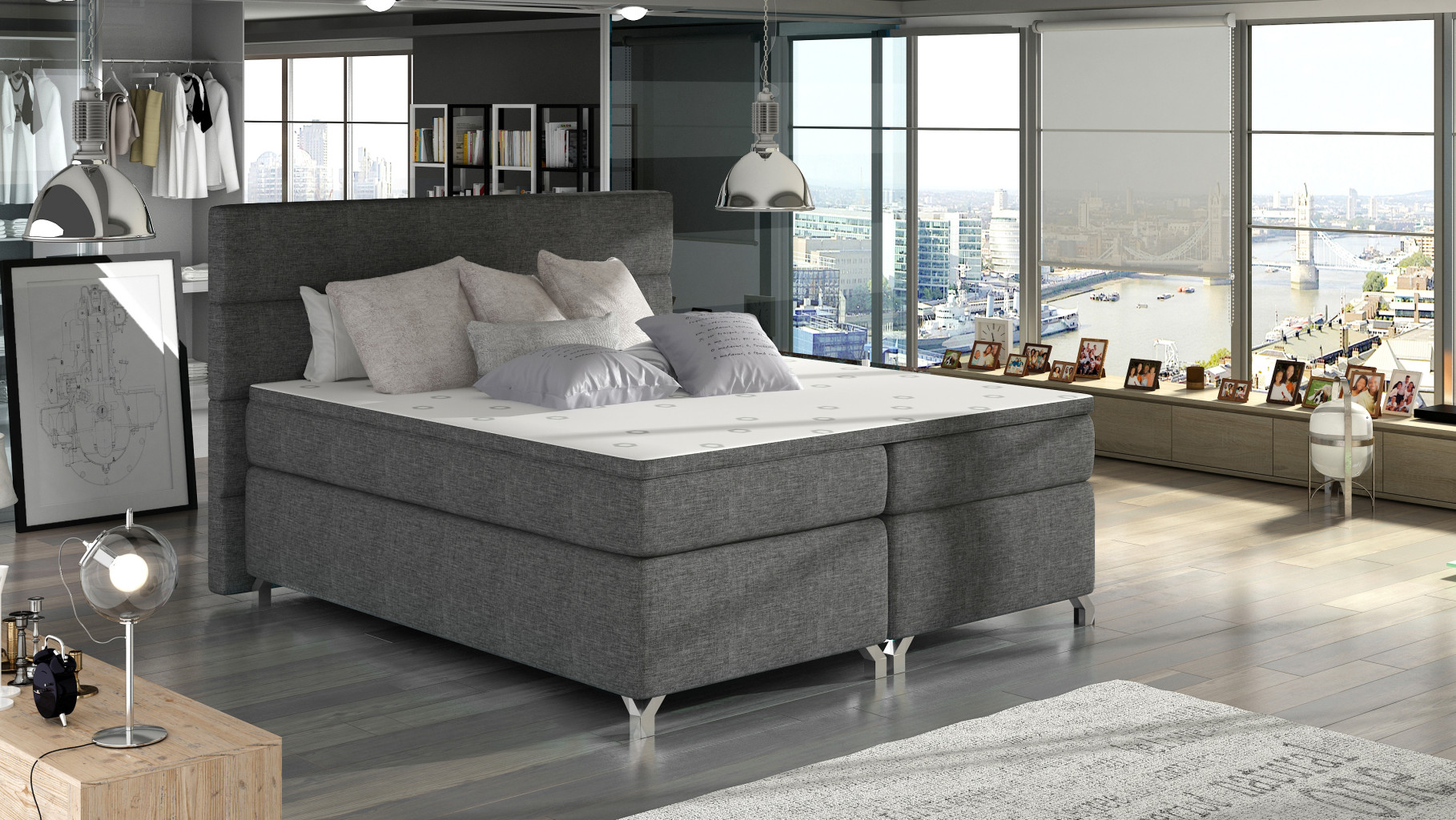 Dotaz na produkt Na splátky ještě dnesAmadeo je mimořádně pohodlná, robustní a originálně navržená boxspringová postel, která zaujme svým neobvyklým tvarem a doplňkovými dekoracemi. Je k dispozici ve třech variantách 140/160/180 x 200 cm, takže si ji velmi snadno přizpůsobíte rozměrům vašeho bytu. Mezi její vlastnosti patří: vysoká matrace, stylová opěrka hlavy vybavená další pěnou T21, prostorný úložný prostor na ložní prádlo, kovové chromované nohy a elegantní čalounění odolné proti oděru a nečistotám, které je k dispozici v mnoha barvách z kolekce Eltap. Nejoriginálnějším dekorativním prvkem našeho nábytku je možnost vybavení LED osvětlením. Samotná matrace je vyrobena z bonelu a dále ze dvou dalších vrstev pěny T25 umístěných v horní a spodní části matrace. Výplň postele byla také vyztužena 4 cm silným topperem z pěny T21. Toto řešení ji činí maximálně pohodlnou. Stojí za to mít ve svém bytě takový funkční kus nábytku.Látky: Sawana 05