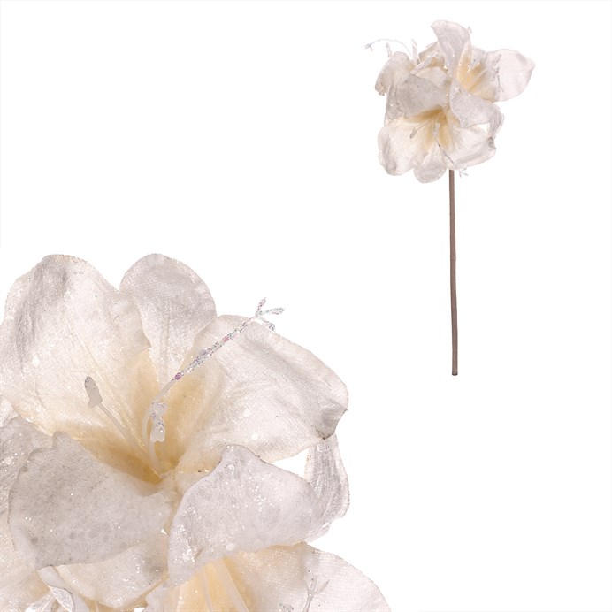 Dotaz na produktElegantní umělý amarylis se třemi květy na stonku vynikne v každém interiéru. Jemná bílá barva doplněná třpytkami dodává květině nádech luxusu. Perfektní volba pro zimní dekorace nebo slavnostní aranžmá.