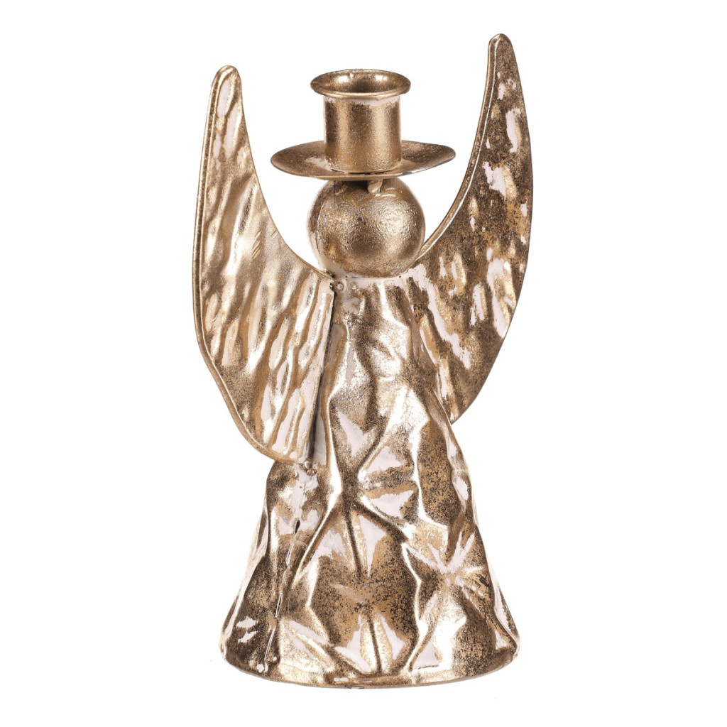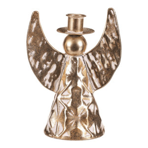 Dotaz na produktTento kovový anděl, vysoký 19 cm, v elegantním zlatém provedení je dokonalou stolní dekorací pro Vánoce. Jeho kulatá hlavička je vybavena kalíškem, kam můžete vložit kónickou svíčku, čímž snadno vytvoříte okouzlující slavnostní atmosféru se třpytivým světlem. Zvoncový tvar anděla a propracovaný design dodávají celé kompozici půvab a sofistikovanost, která skvěle oživí váš vánoční stůl či polici.