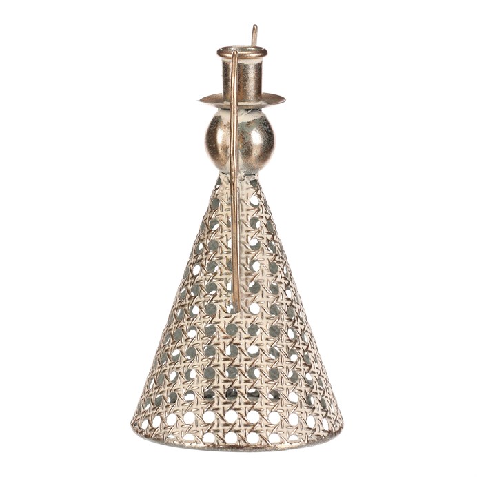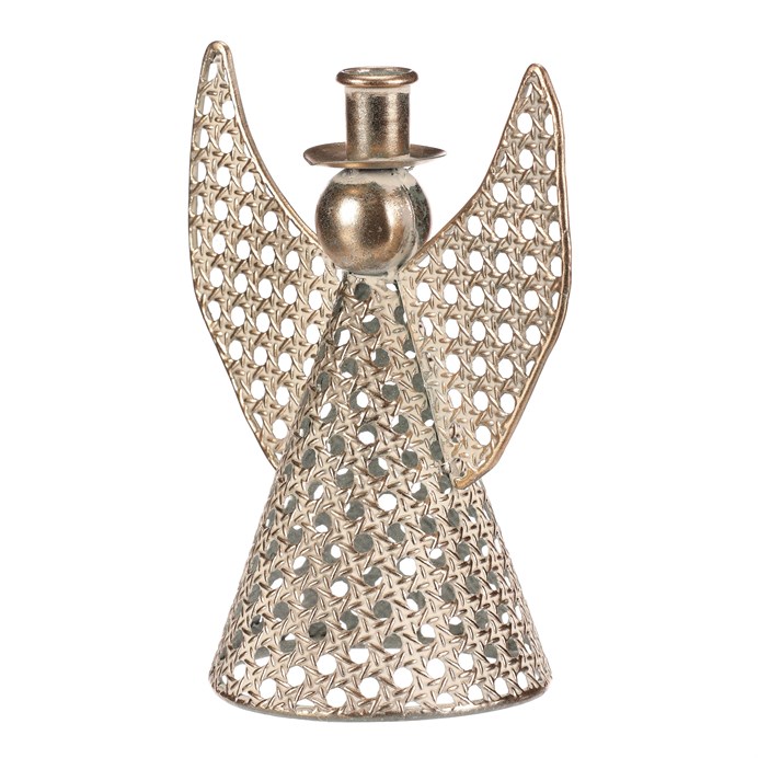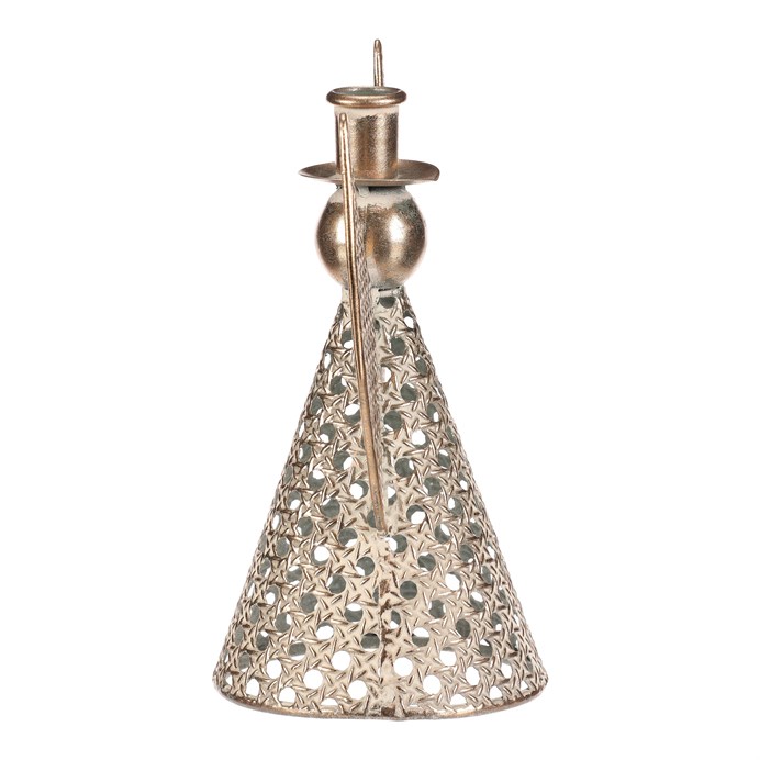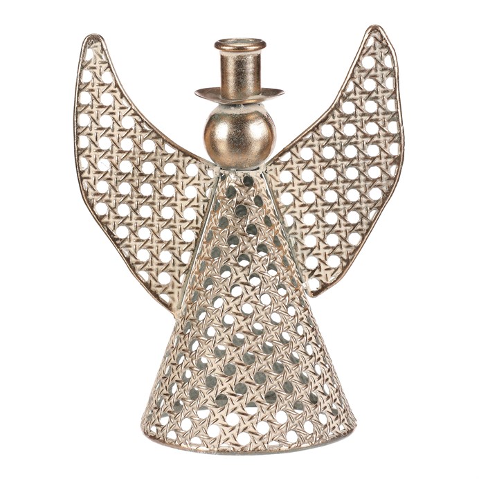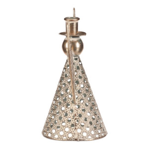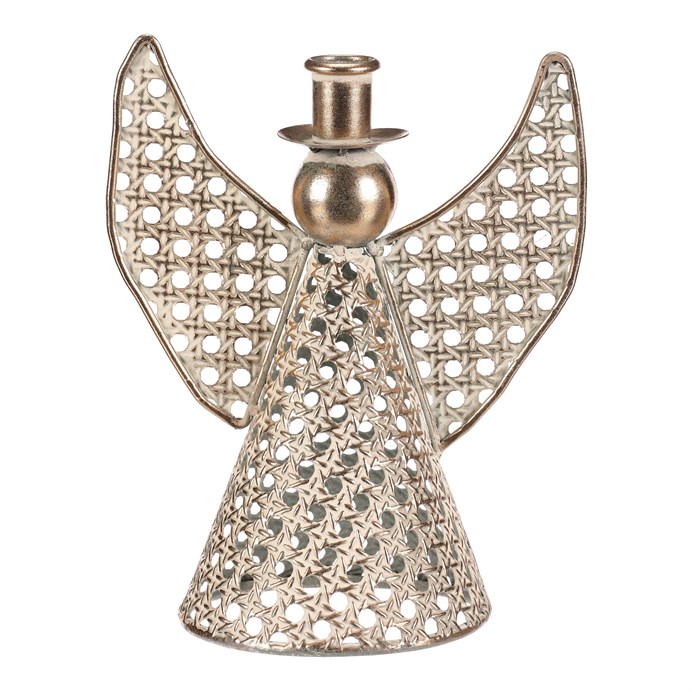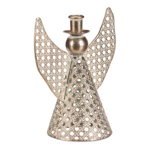 Dotaz na produktKovový anděl vysoký přibližně 22 cm je elegantní vánoční dekorace v champagne odstínu. Na jeho kulaté hlavičce se nachází kalíšek přizpůsobený pro umístění kónické svíčky. Nabízí tak neodolatelnou kombinaci vkusné dekorace s možností vytvořit nádherný světelný efekt. Díky jemným kruhovým otvorům působí vzdušně a vkusně ozdobí váš interiér během svátečního období.