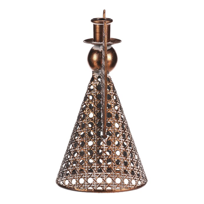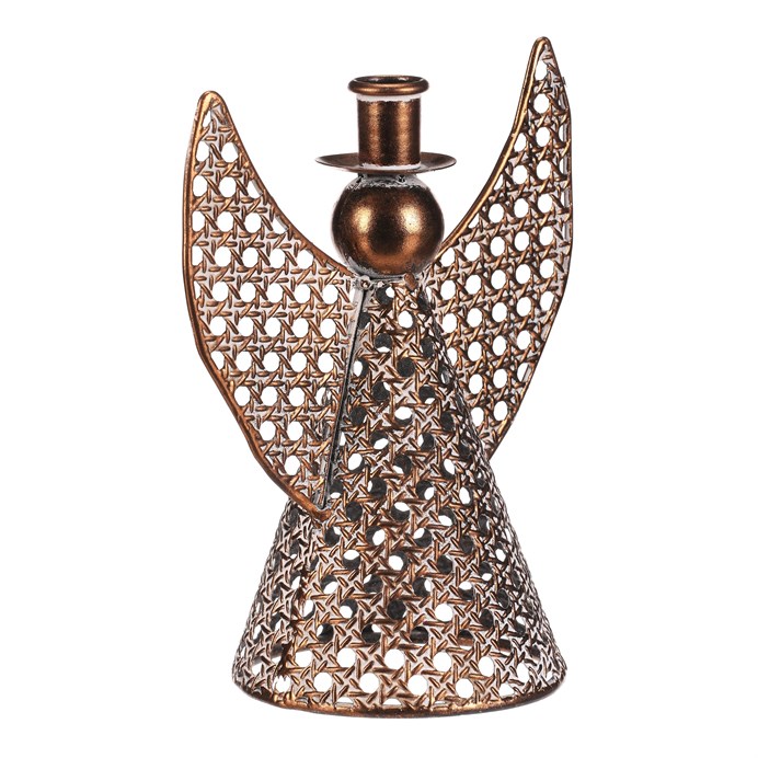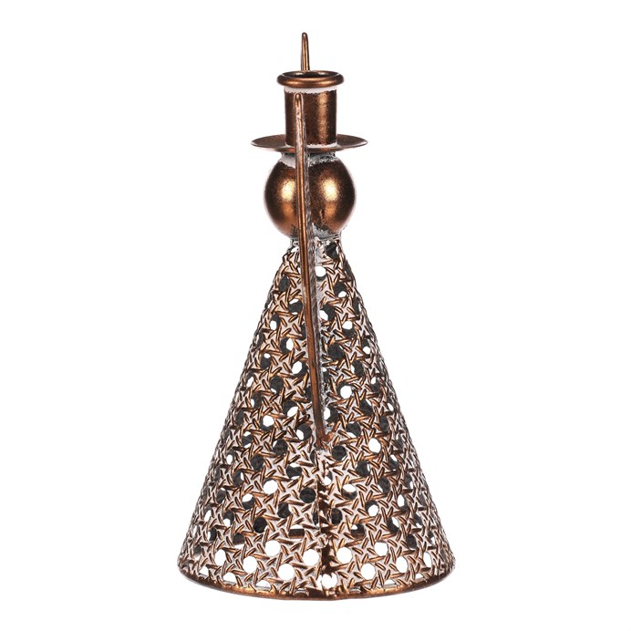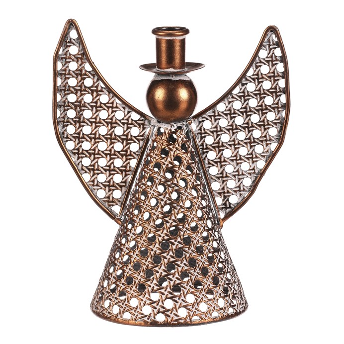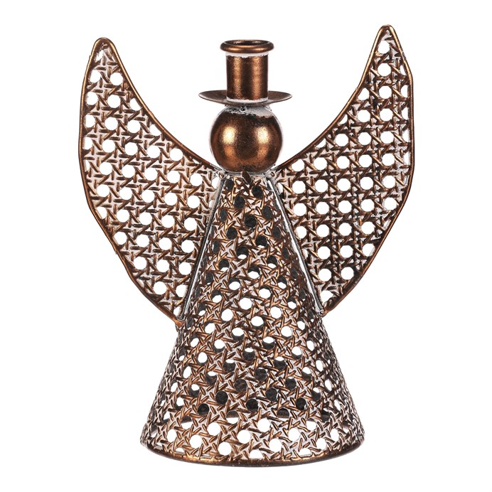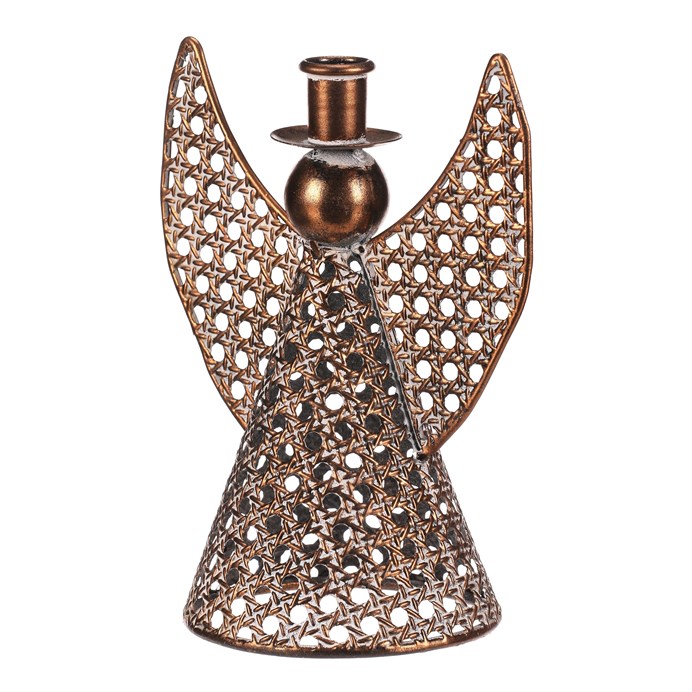 Dotaz na produktKovový anděl vysoký přibližně 22 cm je elegantní vánoční dekorace v měděném odstínu. Na jeho kulaté hlavičce se nachází kalíšek přizpůsobený pro umístění kónické svíčky. Nabízí tak neodolatelnou kombinaci vkusné dekorace s možností vytvořit nádherný světelný efekt. Díky jemným kruhovým otvorům působí vzdušně a vkusně ozdobí váš interiér během svátečního období.