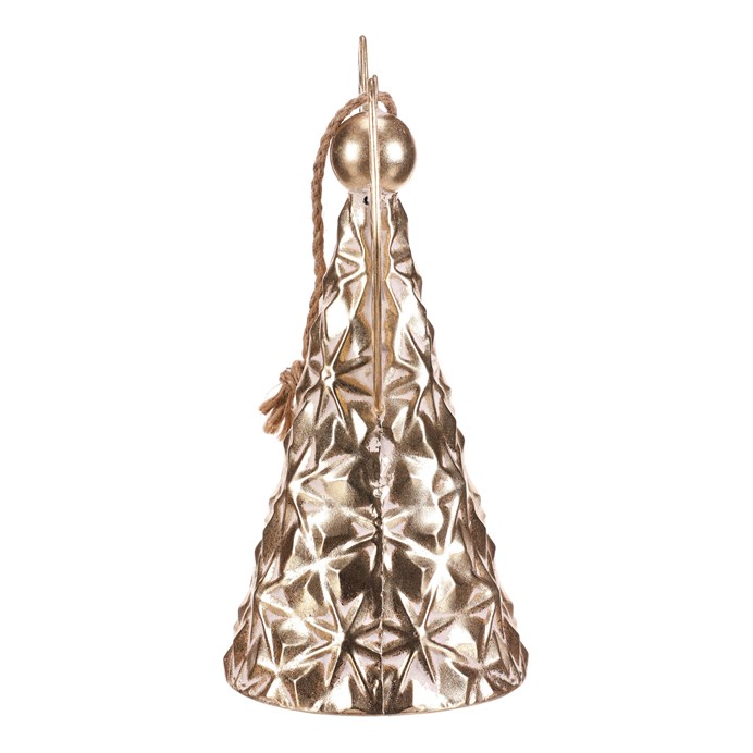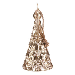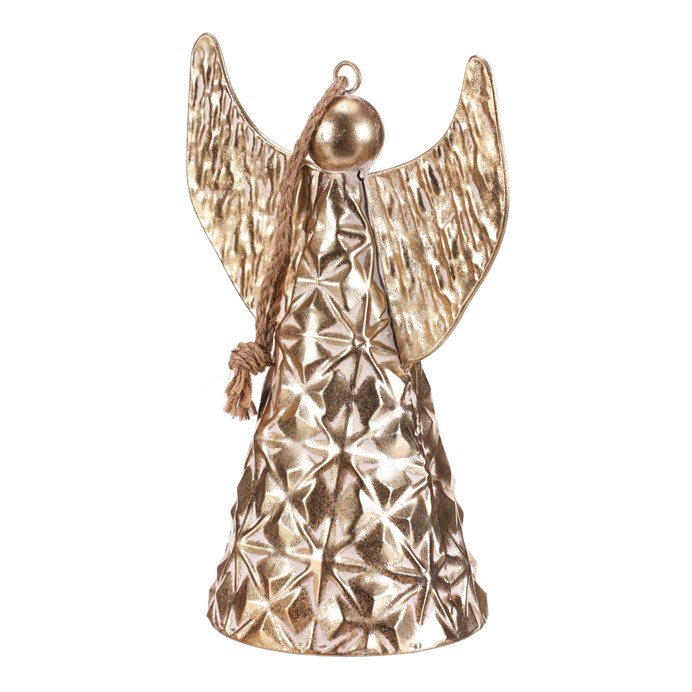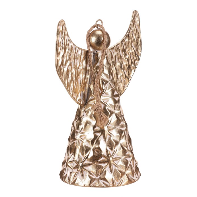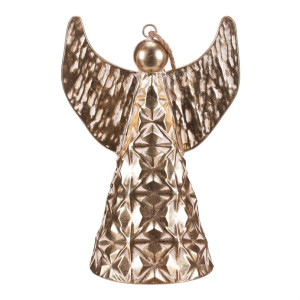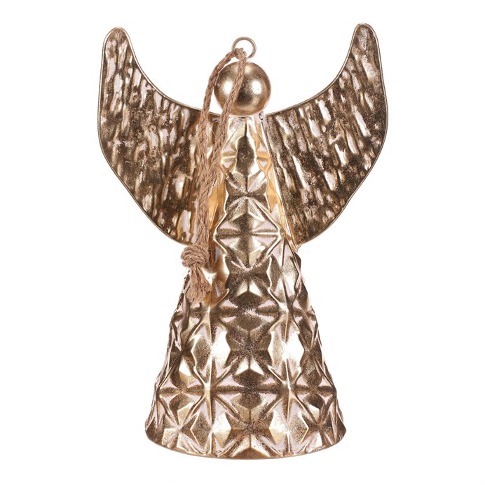 Dotaz na produktKovový anděl ve formě zvonu je krásnou vánoční dekorací v elegantní zlaté barvě. Díky očku a provázku ho snadno zavěsíte kamkoliv, kde chcete vytvořit sváteční atmosféru. Jemný květinový reliéf dodává ozdobě kouzelný a propracovaný vzhled. S výškou 33 cm se stane působivým doplňkem vaší vánoční výzdoby.