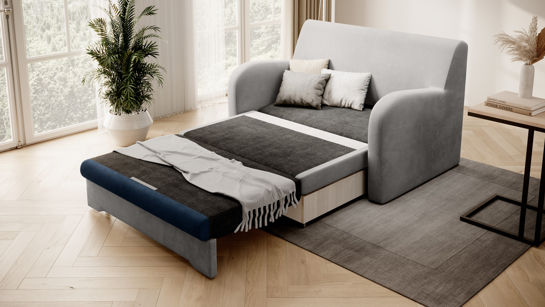 Dotaz na produkt Na splátky ještě dnesPohovka Ario s funkcí spaní je odpovědí na potřeby moderních bytů. Její čalounění dostupné v mnoha barvách a látkách a minimalistický design umožňují, aby se celek dokonale hodil do modernistického uspořádání. Kompaktní rozměry zajistí, že konstrukce nezabere příliš mnoho místa – lze ji umístit do pokoje pro teenagery, pokoje pro hosty nebo menšího obývacího pokoje. Malé plastové nožičky o tloušťce 1,5 cm chrání podlahu před poškrábáním. Zajímavou volbou je použití pěny T28 a pěny T25. Tato kombinace dodává konstrukci značnou měkkost a pružnost, díky čemuž se nedeformuje. Ario nabízí snadno použitelnou funkci spaní (plocha 111 cm x 196 cm) a prostorný úložný prostor na ložní prádlo o rozměrech 85 cm x 61 cm x 13 cm. Proto je ideální pro občasné i každodenní spaní.Látky: Nube 3, Nube 40