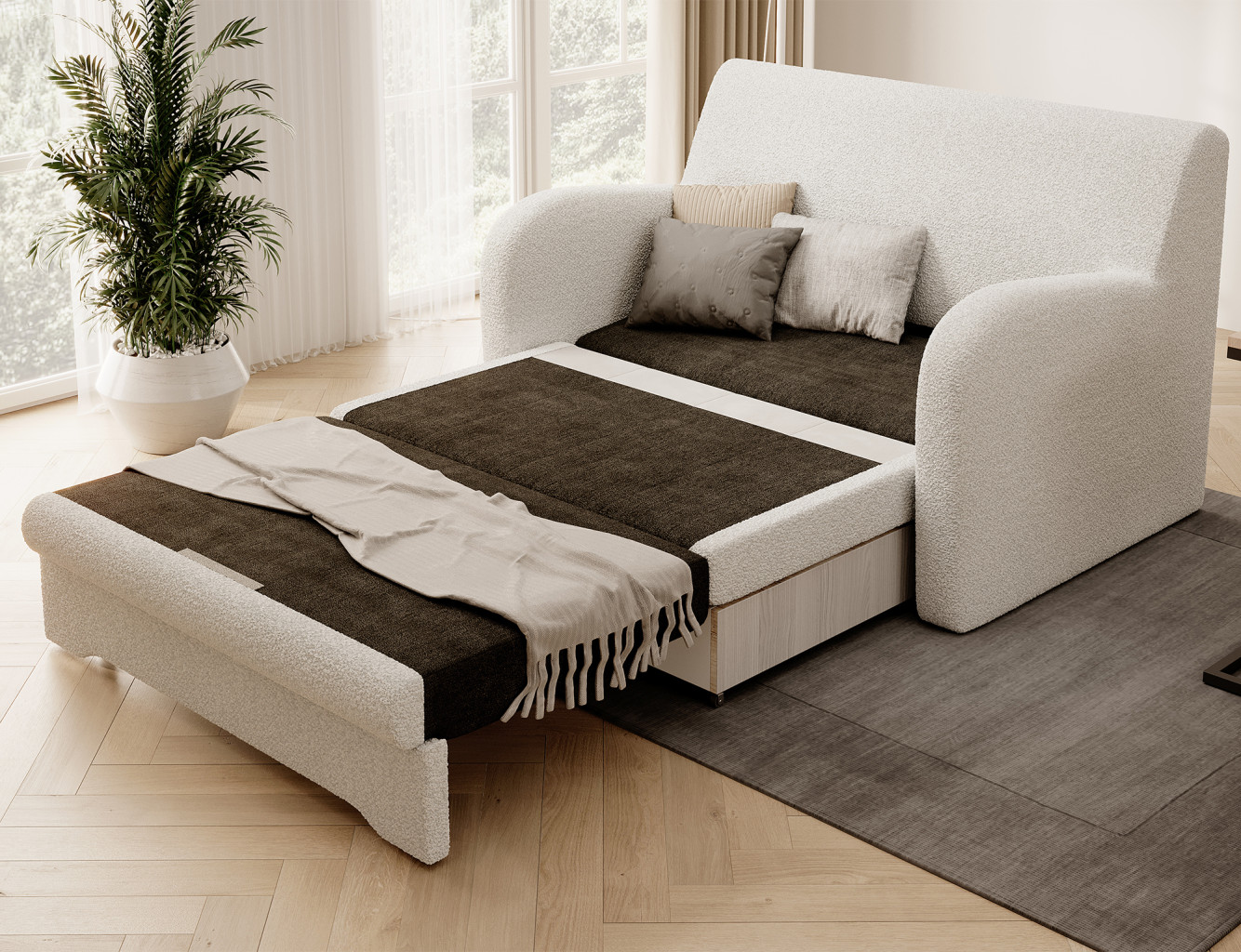 Dotaz na produkt Na splátky ještě dnesRozkládací pohovka Ario je odpovědí na potřeby moderních bytů. Čalounění dostupné v různých barvách a látkách spolu s minimalistickým designem z ní činí perfektní volbu pro moderní interiér. Díky kompaktním rozměrům nezabírá příliš mnoho místa, takže je ideální do pokoje pro mládež, pokoje pro hosty nebo malého obývacího pokoje. Malé plastové nohy o tloušťce 1,5 cm chrání podlahu před poškrábáním. Zajímavostí je použití pěny T28 a T25, která poskytuje značnou měkkost a pružnost a zabraňuje deformacím. Ario se vyznačuje snadno použitelnou funkcí spaní (rozměry povrchu: 111 cm x 196 cm) a prostorným úložným prostorem na ložní prádlo (85 cm x 61 cm x 13 cm). Je ideální pro občasné i každodenní spaní.Látka: Royal 01