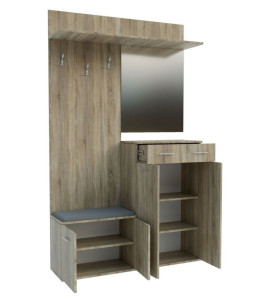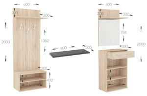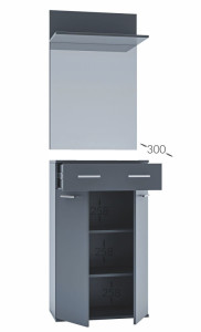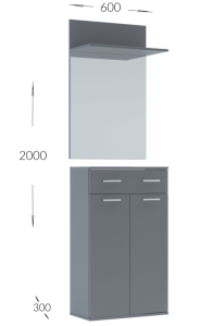 Dotaz na produkt Na splátky ještě dnesPředsíňová stěna vyrobená z kvalitní laminátové desky ( zadní panel HDF ) v barevném provedení grafit šedý. Sestava se skládá ( š/v/h ) - panel s věšákem a komodou ( 60 x 200 x 30 cm ) a panel se zrcadlem a botníkem se zásuvkou ( 60 x 200 x 30 ). Další rozměry viz perokresba. Sedací polštářek je v ceně (barevné provedení polštářku se od obrázku může lišit). Dodáváme v demontovaném stavu.