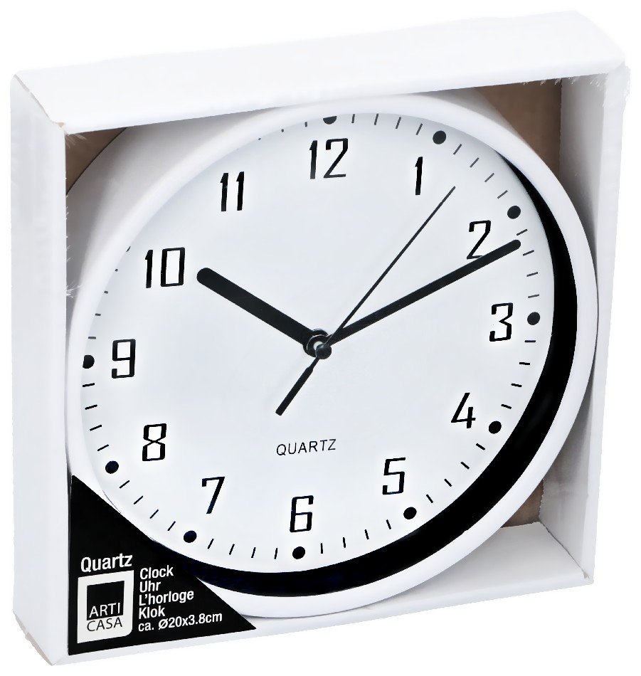 Dotaz na produkt- nástěnné hodiny- průměr 20 cm- výška 3,8 cm- vteřinová ručička- baterie není součástí balení- barva bílá