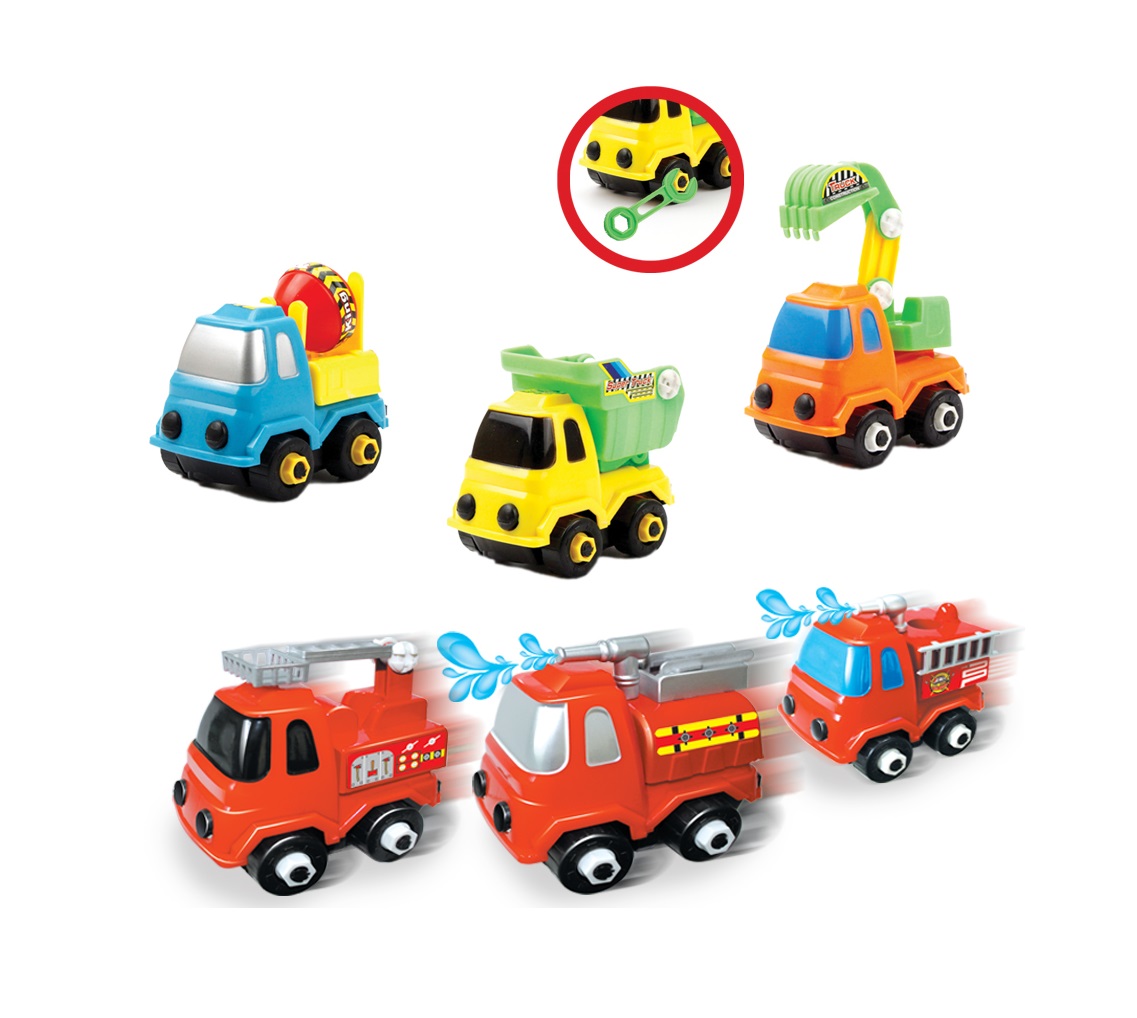 Dotaz na produktAuta šroubovací 3 ks. Rozměry auta 10x8x9 cm. 2 varianty - stavební, hasičské. Volná kola.