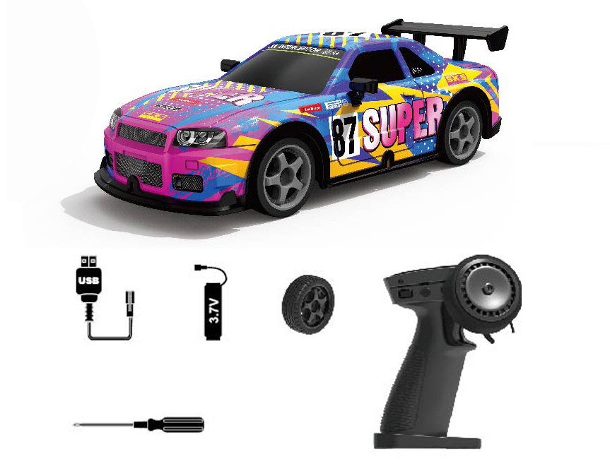 Dotaz na produktAuto 87 Super driftující svítící RC na dálkové ovládání. Rozměry 20x8x6 cm. Frekvence 2.4GHz. Pistolový ovladač. Součástí 4 standardní a 4 driftující kola. Světelné efekty povrchu auta tlačítkem na ovladači. Bateriový pack 3.7V 500mAh lithium do auta součástí, 2xAA do ovladače nejsou součástí. Try Me tlačítko pro světelné efekty v obalu - 3xAG13 baterie (neměnitelné) součástí. Při vybalování nutno odpojit Try Me kabel z auta. USB kabel součástí. Rychlost 12 km/h. Provoz až 20 min, nabíjení 2 h, dosah až 40 m. Přepínač ON/OFF na spodní straně auta a na ovladači.
