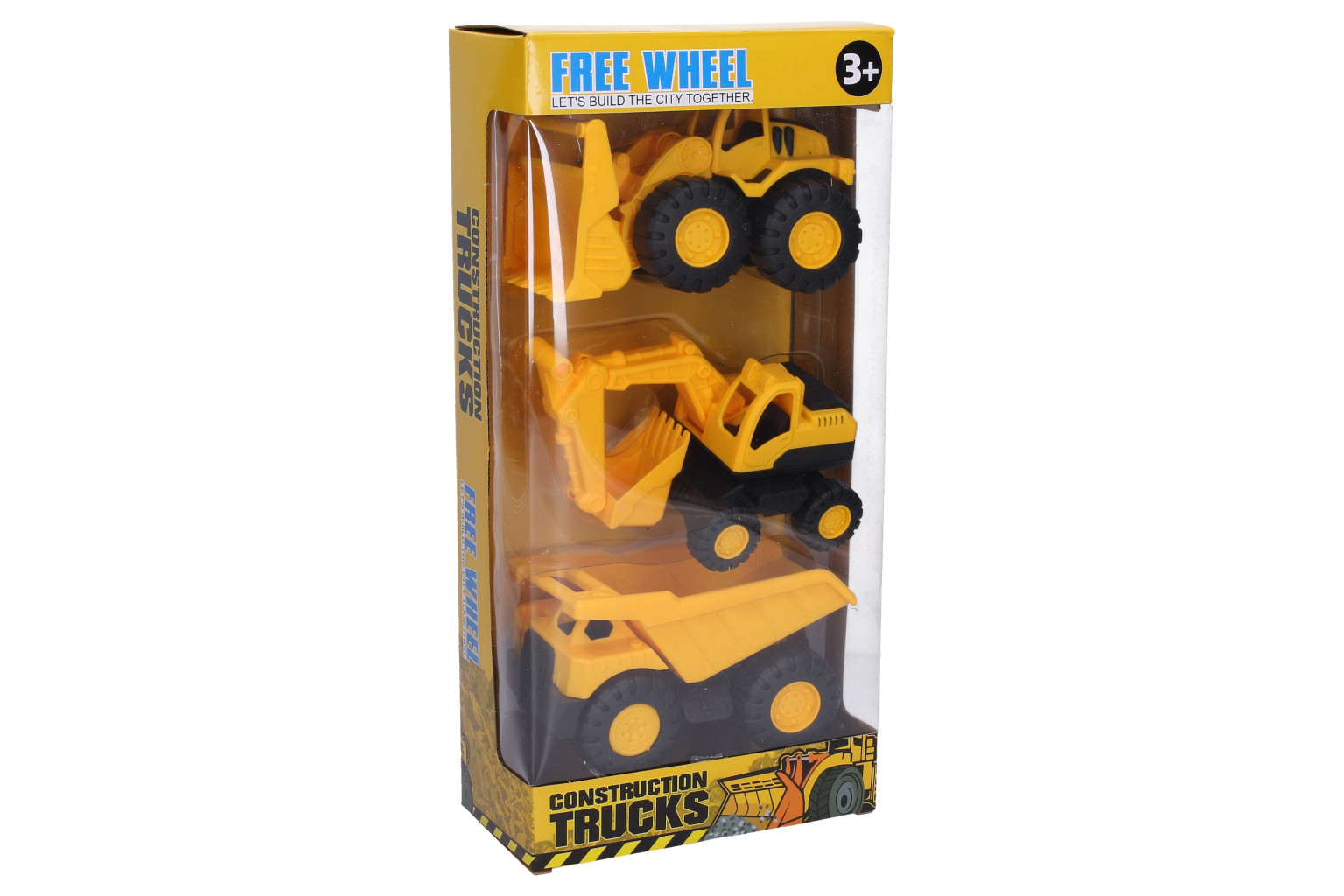 Dotaz na produktAuto stavební stroj. Velikost 12 cm. Balení obsahuje 3 ks - buldozer, bagr, sklápěč. Sklápěč má sklápěcí korbu. Bagr a buldozer mají polohovatelné lžíce. Volná kola.