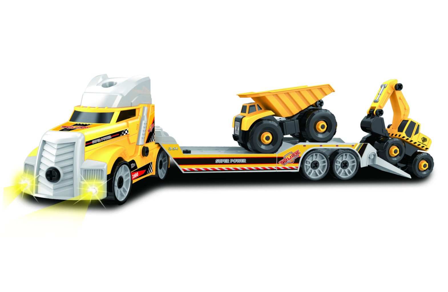 Dotaz na produktRozměry tahače 62x10x15 cm. Volná kola. Balení obsahuje tahač a 2 stavební stroje 16 cm (sklápěč, bagr), křížový šroubovák (v rukojeti je klíč na matice). Vydává světelné a zvukové efekty. Aktivace efektů se provádí ON/OFF přepínačem na spodní straně tahače.