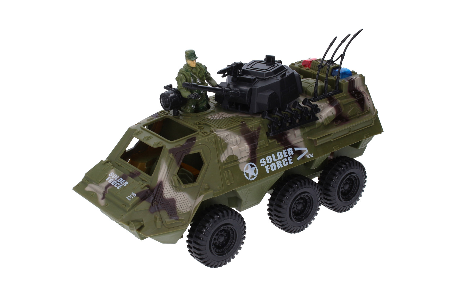 Dotaz na produktAuto vojenské. Velikost 30 cm. Volná kola. Součástí auto, voják, zbraně.