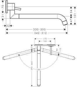 vývod 330 mmrozsah otáčení nastavitelný ve 2 krocích 110° a 150°rukojeť může být umístěna vpravo nebo vlevo, podle instalace podomítkového tělesakeramická kartuše, typu joysticks vytahovací...