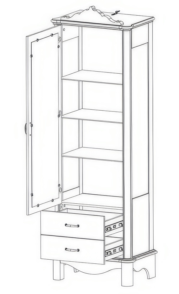 Pevné ozdobné nožičky dodávají nábytku stabilitu. Obsahuje prosklené dvířka a 2 zásuvky.