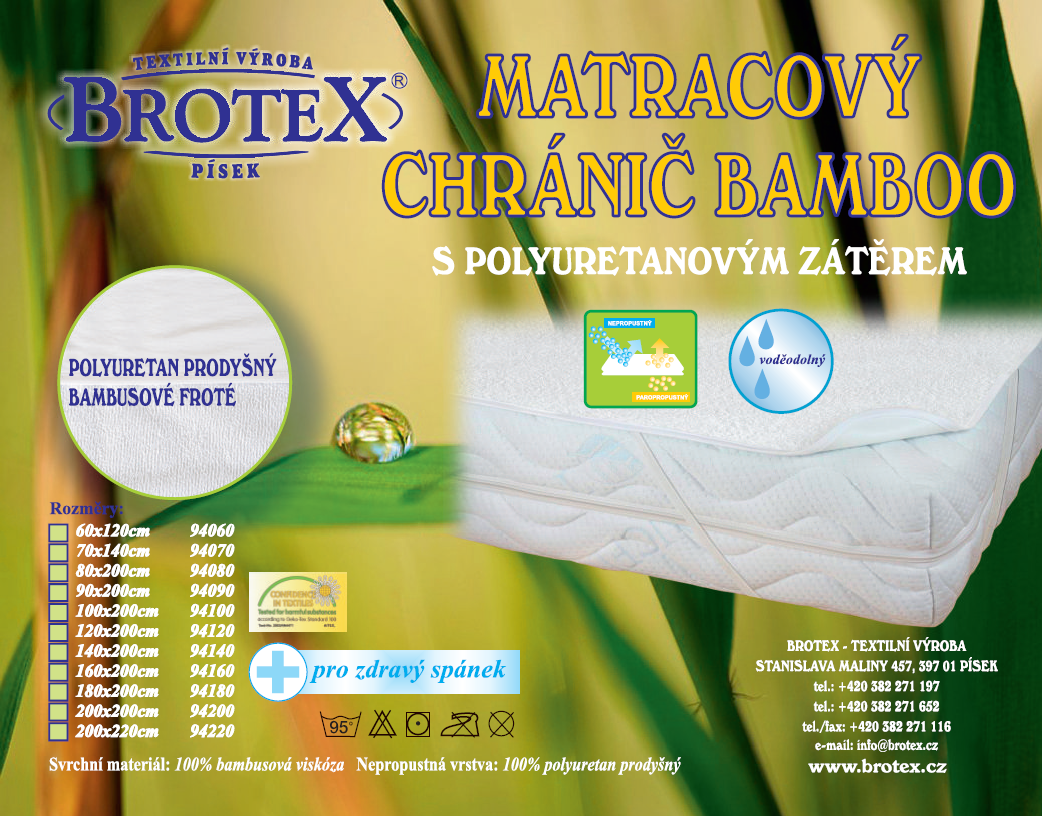 Velmi komfortní nepropustný chránič matrace s povrchem z bambusového vlákna, které je velmi příjemné na omak. Spodní vrstva chrániče je z PU zátěru, nepropustného a prodyšného materiálu, který ochrání matraci proti jakékoliv tekutině.