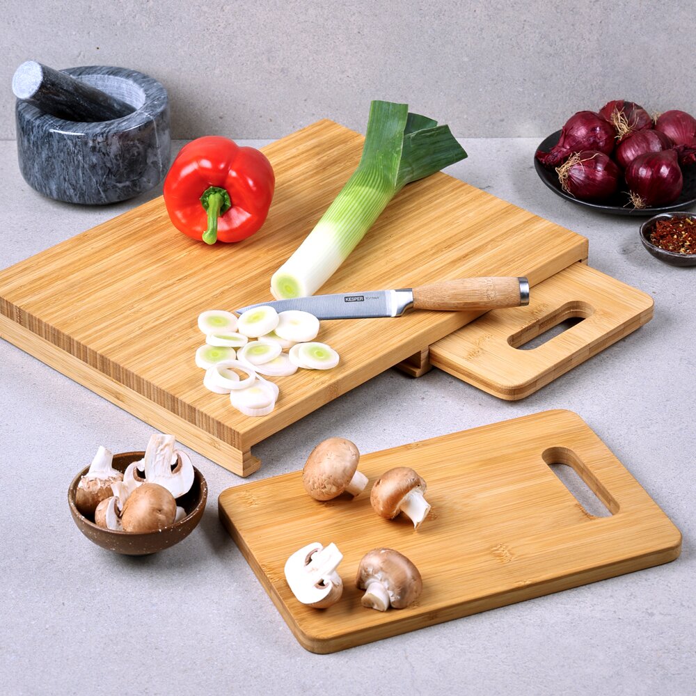 Sada tří bambusových prkének značky Kesper představuje odolné a ekologické řešení pro každodenní práci v kuchyni. Vyrobena jsou z FSC® certifikovaného bambusu ošetřeného BIOFA olejem, který odpuzuje vlhkost a prodlužuje jejich životnost. Sada obsahuje dvě menší a jedno velké prkénko, takže se skvěle hodí pro různé druhy potravin a přípravy. Bambusová prkénka jsou hygienická, snadno se čistí a navíc působí elegantně.