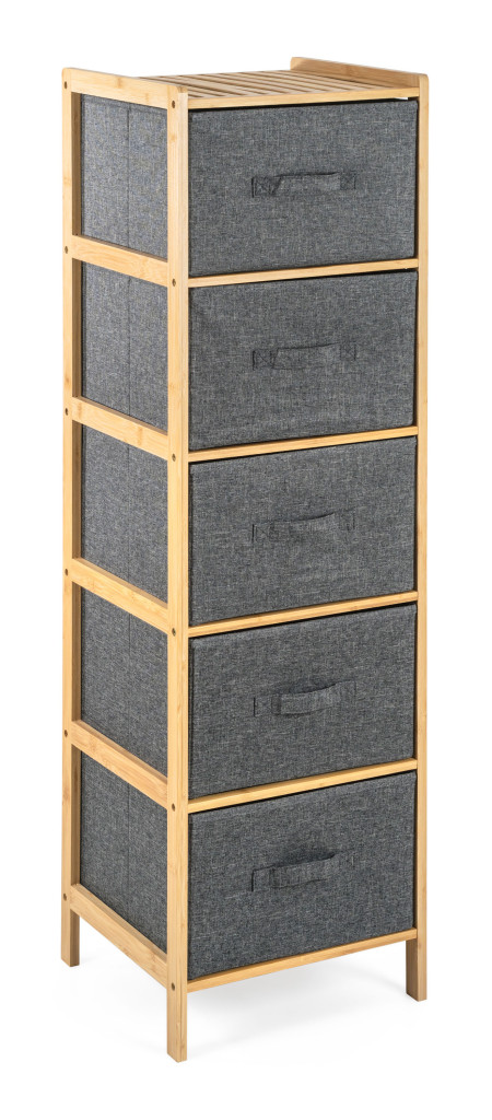 Praktický stojan s 5 výsuvnými textilními košíky ušetří spoustu místa a uložíte do něj vše, co potřebujete. Potřeby na praní nebo kosmetiku, oblečení i dětské hračky. Každý košík má objem 21 litrů, šířka je 33 cm, výška 19 cm a hloubka 35 cm. Celý stojan má na výšku 1,20 m.