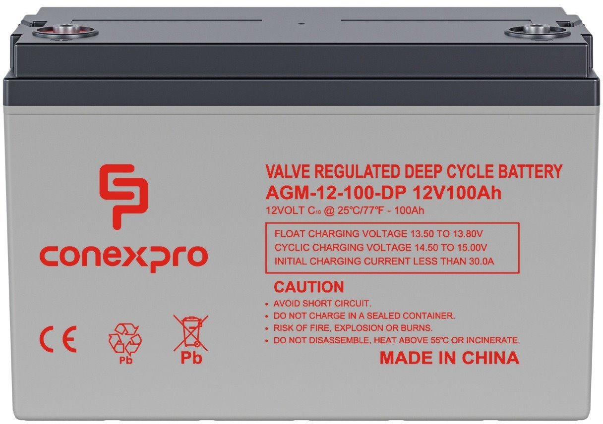 Baterie Conexpro AGM-12-100-DP využívá moderní AGM technologii (Absorbent Glass Mat), která bezpečně váže elektrolyt do skelných vláken a zajišťuje vysokou cyklickou odolnost. Díky tomu zvládne stovky až tisíce cyklů a poskytuje stabilní výkon i při opakovaném hlubokém vybíjení. Je bezúdržbová, spolehlivá a vhodná pro širokou škálu aplikací od solárních systémů až po náročné profesionální využití.