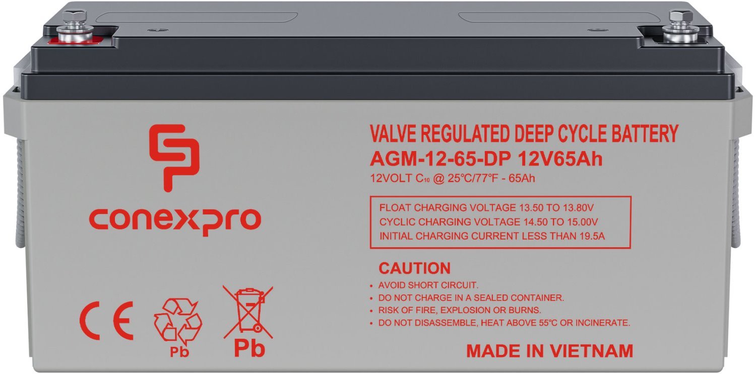 Baterie Conexpro AGM-12-65-DP je navržená pro náročné aplikace s pravidelným cyklickým provozem. Díky technologii Absorbent Glass Mat (AGM) je elektrolyt bezpečně vázán ve skelných mikrovláknech, což zabraňuje jeho úniku a zajišťuje dlouhou životnost a vysokou odolnost vůči hlubokému vybíjení. Skvěle se hodí pro použití v solárních systémech, záložních zdrojích UPS, karavanech, lodích i v bezpečnostní a IT technice. Její konstrukce umožňuje provoz v různých polohách a M6 konektory zajišťují snadné připojení k zařízení. Díky nízkému samovybíjení je baterie připravena k použití i po delší době nečinnosti.