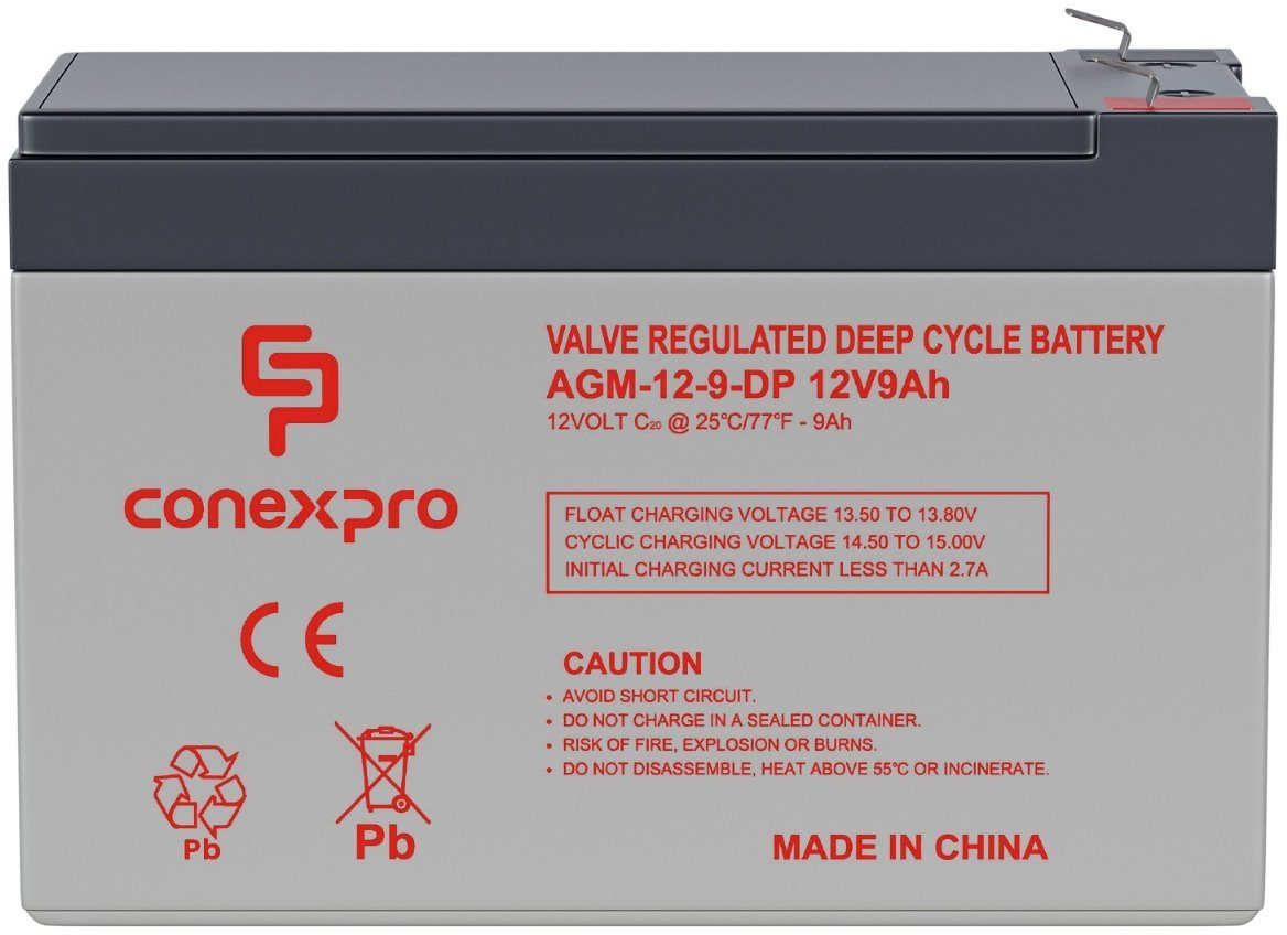 Baterie Conexpro AGM-12-9-DP využívá technologii Absorbent Glass Mat, která zajišťuje bezpečné vázání elektrolytu a vysokou odolnost vůči cyklickému provozu. Díky této konstrukci dosahuje stovek až tisíců cyklů a poskytuje stabilní výkon i při hlubokém vybíjení. Je bezúdržbová, spolehlivá a vhodná pro širokou škálu aplikací od solárních systémů přes UPS až po speciální zařízení.