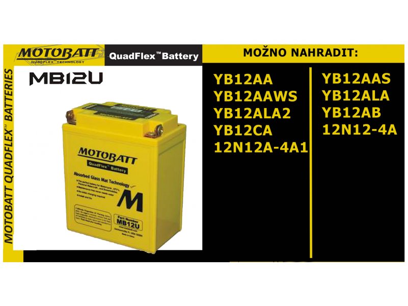 Motobaterie Motobatt MB12U 15 Ah slouží jako náhrada baterií: 12N12-4A, 12N12A-4A-1, CB12A-A, CB12A-AS, CB12A-AWS, CB12AL-A, CB12AL-A2, CB12A-B, CB12C-A, MB12U.