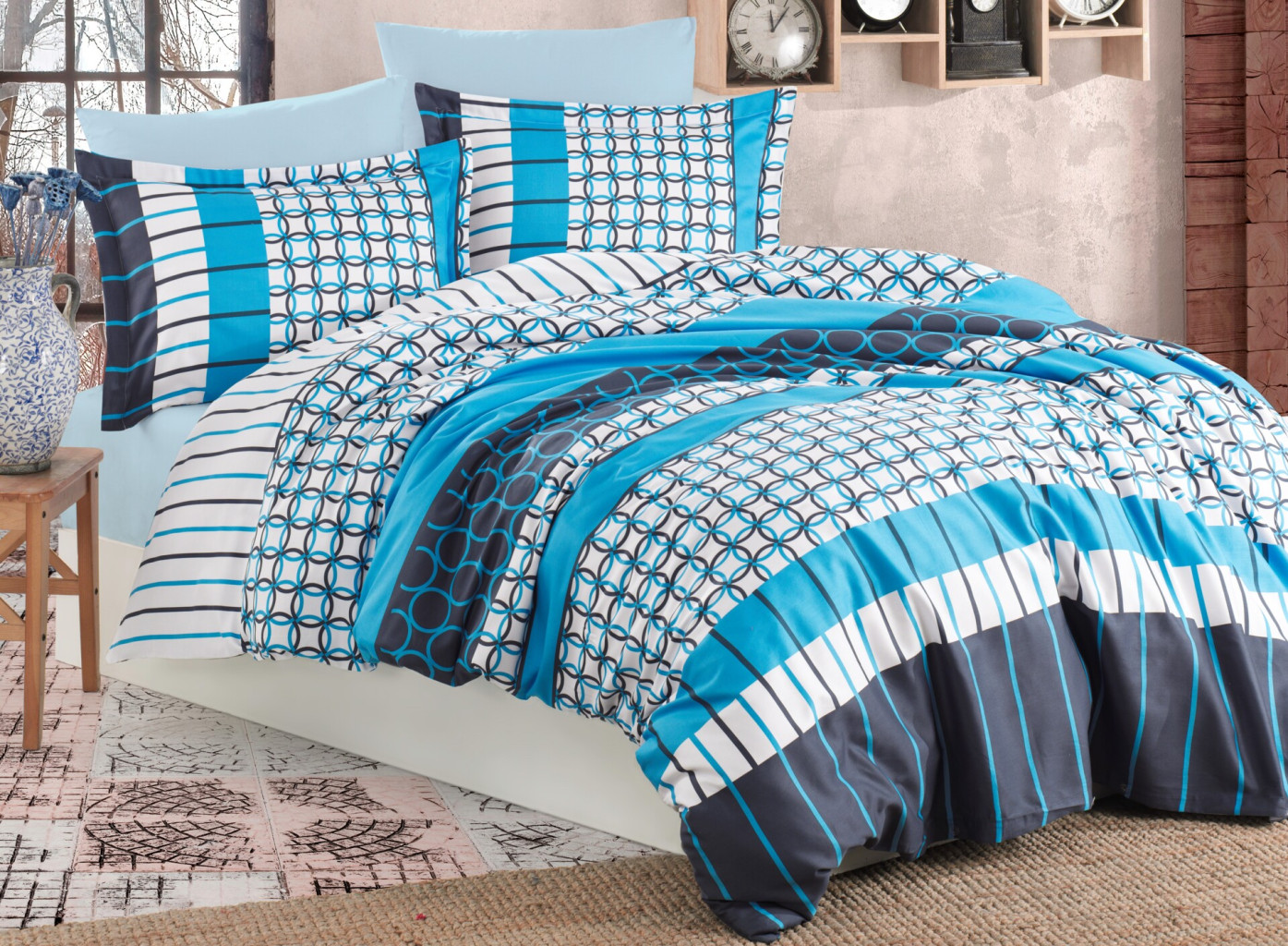 Povlaky jsou vyrobeny z velmi jemné 100% bavlněné tkaniny se zapínáním na zip. Plošná hmotnost (gramáž) tkaniny je 125g/m2. Tkanina má vysokou hustotu velmi jemných přízí a pro tyto své vlastnosti je velice jemná a příjemná na omak.