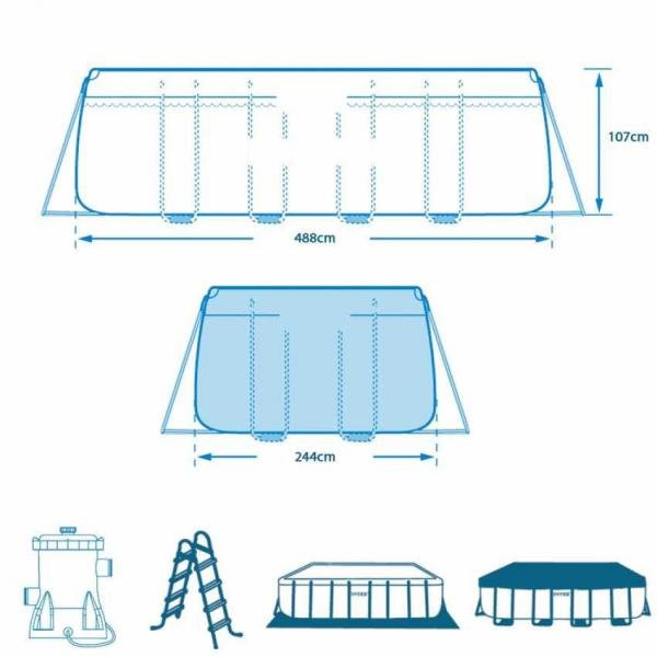 Bazén INTEX Prism Frame 488 x 244 x 107 cm je zahradní bazén s kovovým rámem pro povrchovou montáž. Včetně kartušové filtrace 3.785 l/hod a příslušenství. Jednoduše smontovatelný, robustní bazén s dlouhou životností.