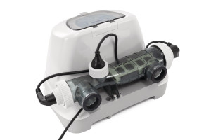 Udržujte vodu v bazénu čistou a dezinfikovanou během celého léta pomocí solinátoru Intex, který vytváří chlor (množství: 16 g/h) a ničí bakterie a řasy. Velká titanová elektroda zajišťuje vyšší produkci chlóru za použití nižší koncentrace soli (u tohoto modelu stačí pouhých 950 ppm). Kontrolní panel je intuitivní a snadno se ovládá. Představuje 4 samočisticí módy s cykly dezinfekce 2/4/6/10 hodin. Vyžaduje filtrační pumpu o průtoku mezi 2650-12112 L/h. Určeno pro bazény o maximálním objemu: 68 000 l.