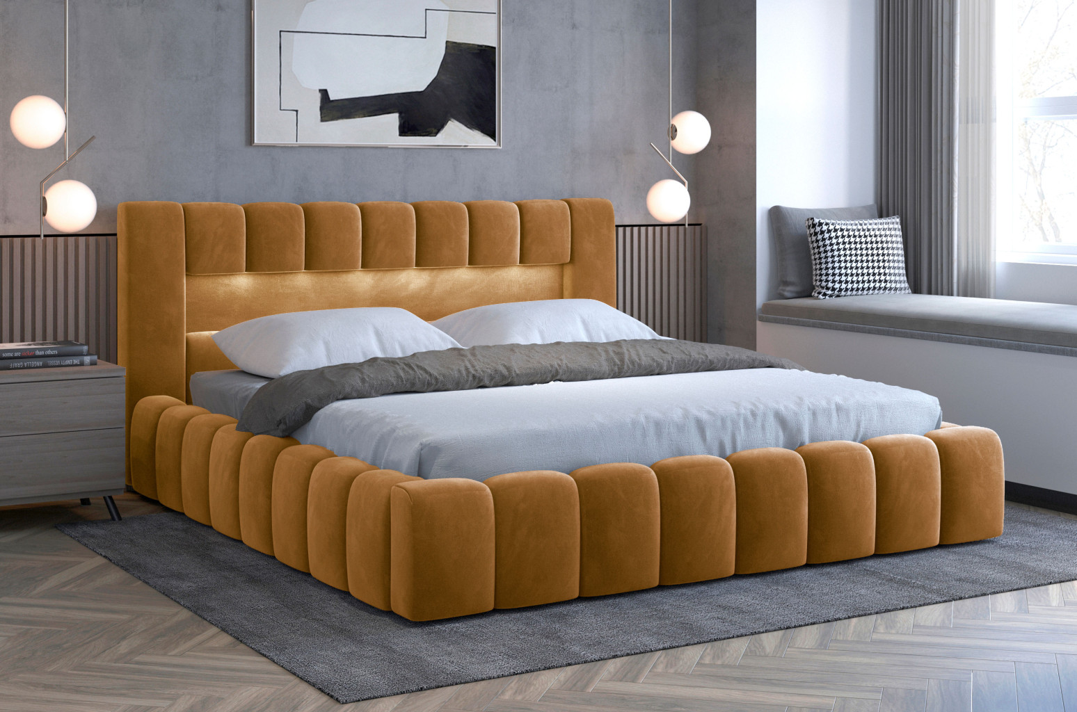 Dotaz na produkt Na splátky ještě dnesLamica je velmi pohodlná, měkká a originální postel v glamour stylu, která zaujme svým nebývalým tvarem a formou. Tento nábytek se skládá z korpusu a dřevěného rámu. Má také dva prostorné úložné prostory na ložní prádlo. Rozměry spací plochy – můžete si vybrat ze tří verzí – 140/160/180x200 cm – poskytují dostatek prostoru pro relaxační odpočinek v ložnici různých velikostí, který bude vyhovovat vašim preferencím a možnostem. Naše postel se vyznačuje svým zpracováním, protože vysoká opěrka hlavy a boky postele jsou vytvořeny s dodatečnou pěnou. Estetický zážitek je umocněn podélným, rozsáhlým prošíváním. Široká škála barevných možností usnadňuje sladění postele s celým pokojem. Další výhodou je opěrka hlavy s LED osvětlením, díky kterému bude odpočinek ještě příjemnější. V tomto případě jde modernita a moderní provedení ruku v ruce s elegancí, díky čemuž bude Lamica vždy ideální volbou. Určitě stojí za to ho mít. Materiál: Monolith 48