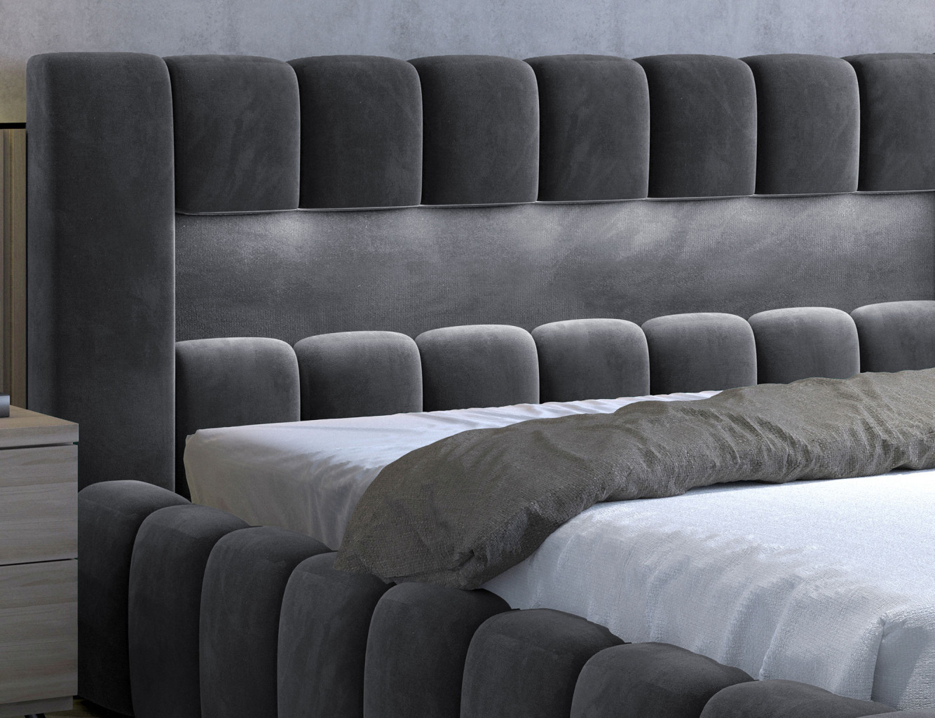 Dotaz na produkt Na splátky ještě dnesLamica je velmi pohodlná, měkká a originální postel v glamour stylu, která zaujme svým nebývalým tvarem a formou. Tento nábytek se skládá z korpusu a dřevěného rámu. Má také dva prostorné úložné prostory na ložní prádlo. Rozměry spací plochy – můžete si vybrat ze tří verzí – 140/160/180x200 cm – poskytují dostatek prostoru pro relaxační odpočinek v ložnici různých velikostí, který bude vyhovovat vašim preferencím a možnostem. Naše postel se vyznačuje svým zpracováním, protože vysoká opěrka hlavy a boky postele jsou vytvořeny s dodatečnou pěnou. Estetický zážitek je umocněn podélným, rozsáhlým prošíváním. Široká škála barevných možností usnadňuje sladění postele s celým pokojem. Další výhodou je opěrka hlavy s LED osvětlením, díky kterému bude odpočinek ještě příjemnější. V tomto případě jde modernita a moderní provedení ruku v ruce s elegancí, díky čemuž bude Lamica vždy ideální volbou. Určitě stojí za to ho mít.Látka: Monolith 85