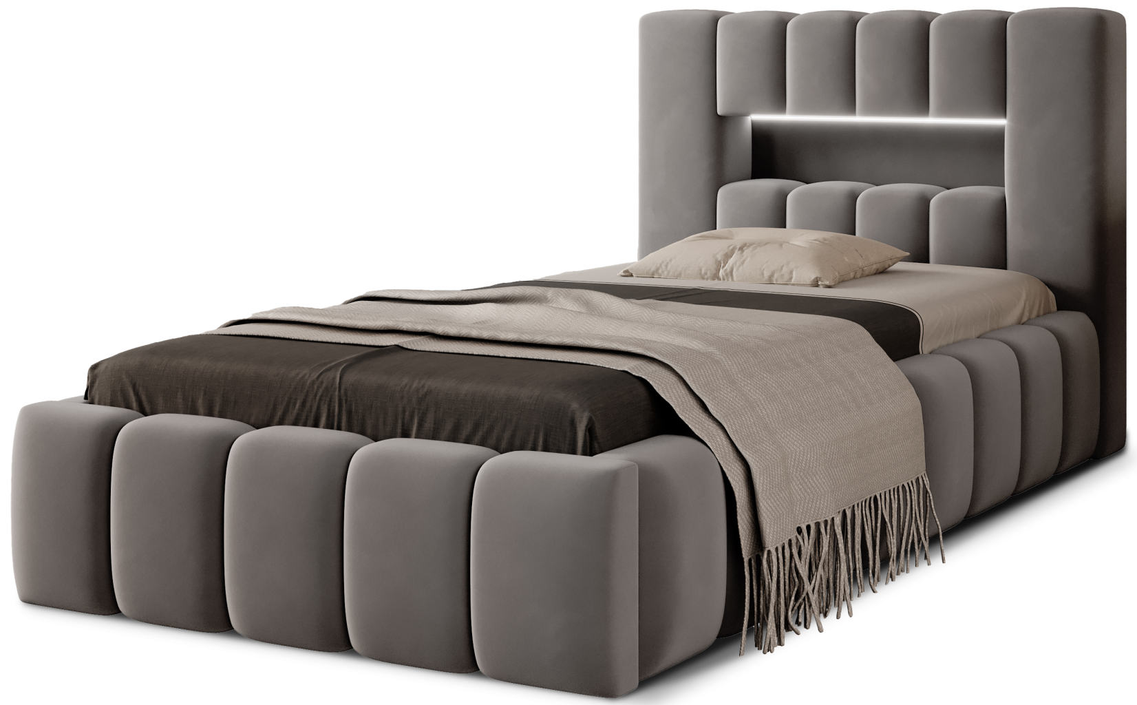 Dotaz na produkt Na splátky ještě dnesLamica je velmi pohodlná, měkká a originální postel v glamour stylu, která zaujme svým neobvyklým tvarem a formou. Tento kus nábytku se skládá z korpusu a dřevěného rámu. Součástí je také přihrádka na ložní prádlo. Rozměry spací plochy 90x200 cm poskytují dostatek prostoru pro nerušený odpočinek. Naše postel vyniká svou kvalitou, protože vysoké čelo a boky postele jsou vyrobeny z dodatečné pěny. Estetický zážitek je umocněn podélným, rozsáhlým prošíváním. Široká škála barevných provedení usnadňuje sladění postele s celým pokojem. Další výhodou je opěrka hlavy s LED osvětlením, díky čemuž je odpočinek ještě příjemnější. Modernita a modernistický vzhled zde jdou ruku v ruce s elegancí, což dělá z Lamicy perfektní volbu v každém případě. Je to kus nábytku, který stojí za to mít. Látky: Nube 4